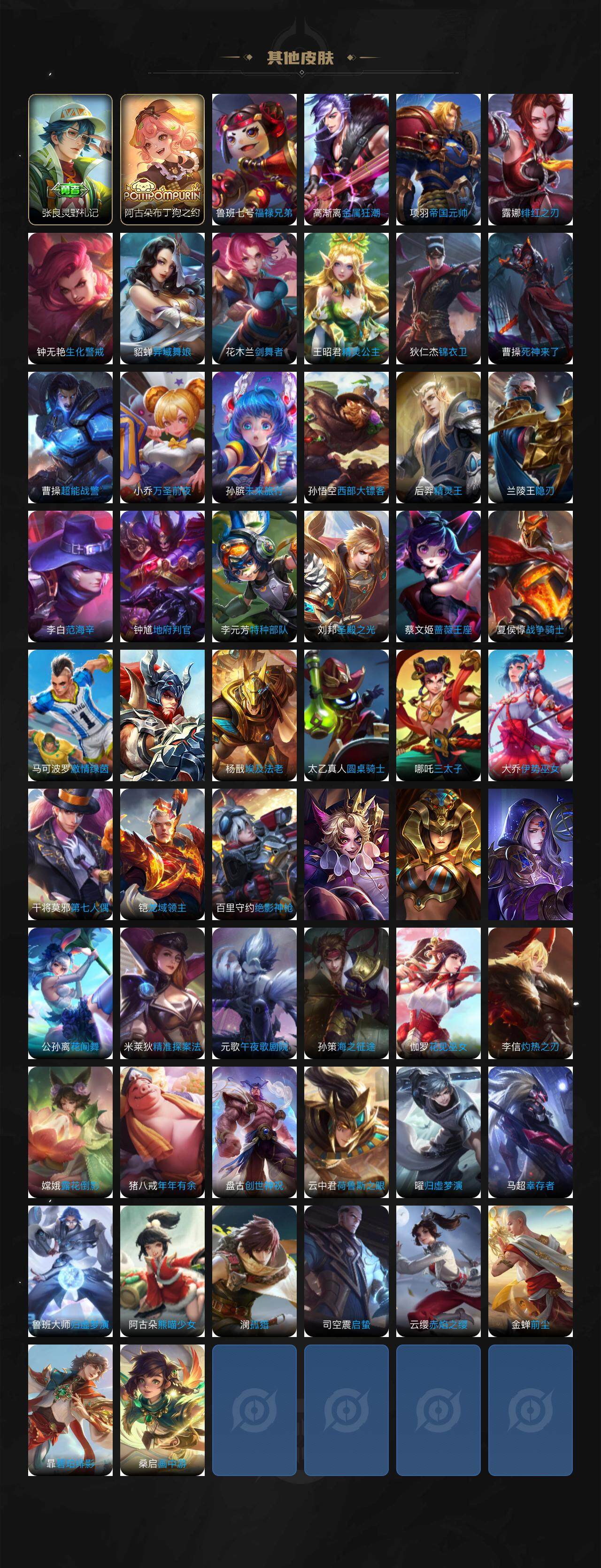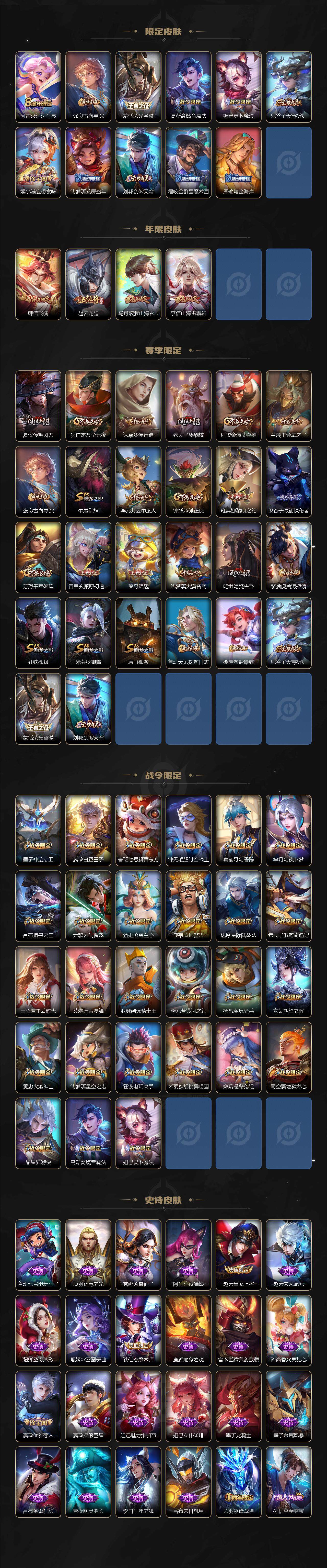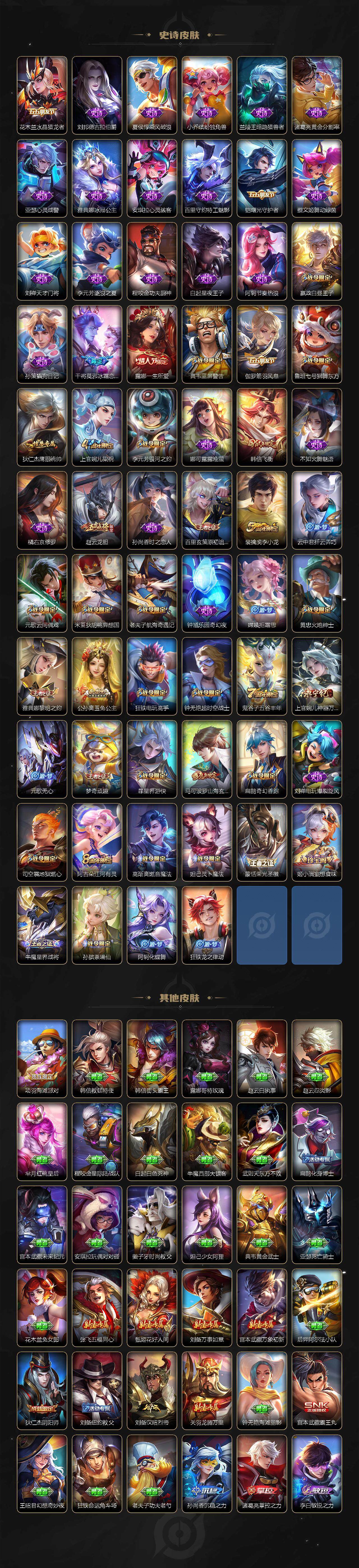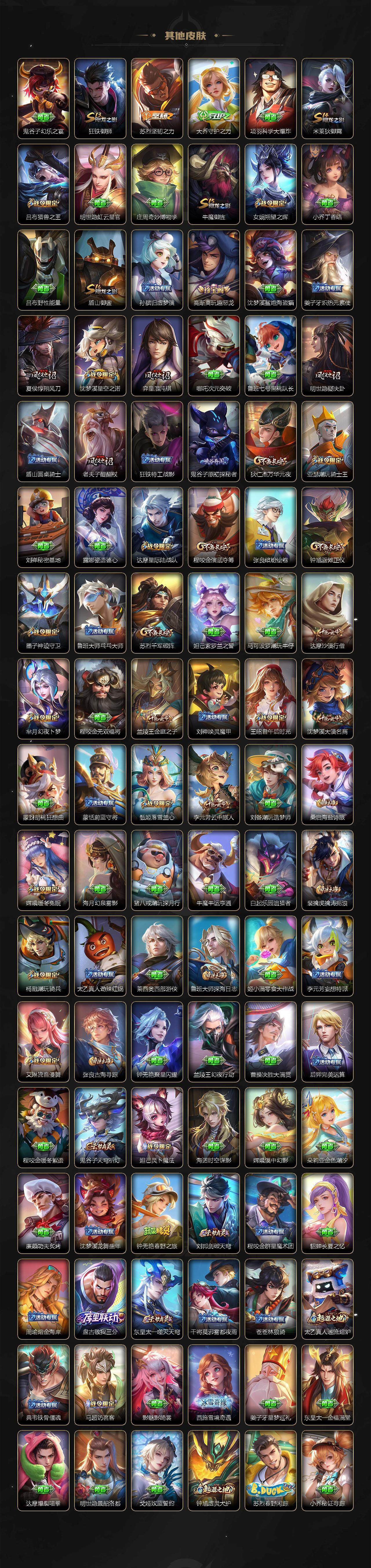 【限定皮肤】:狄仁杰阴阳师,赵云皇家上将,赵云龙胆,墨子神迹守卫,嬴政优雅恋人,嬴政白昼王子,鲁班七号狮舞东方,高渐离玩趣恶龙,钟无艳超时空战士,扁鹊奇幻香踪,芈月幻夜卜梦,吕布猎兽之王,元歌云间偶戏,元歌无心,夏侯惇朔风刀,甄姬落雪兰心,典韦蓝屏警告,马可波罗山海玄木吟,狄仁杰魔术师,狄仁杰万华元夜,达摩星际陆战队,达摩沙漠行僧,项羽海滩派对,老夫子醍醐杖,老夫子航海奇遇记,关羽冰锋战神,程咬金演武夺筹,露娜一生所爱,韩信飞衡,王昭君午后时光,兰陵王金庭之子,亚瑟潮玩骑士王,孙悟空至尊宝,孙悟空齐天大圣,牛魔御旌,李元芳银河之约,李元芳云中旅人,虞姬启明星使,钟馗驱傩正仪,杨戬潮玩骑兵,女娲朔望之晖,干将莫邪冰霜恋舞曲,雅典娜黎明之约,鬼谷子原初探秘者,鬼谷子五谷丰年,黄忠火炮绅士,苏烈千军破阵,百里玄策原初追逐者,弈星混沌棋,梦奇顽趣,公孙离玉兔公主,沈梦溪星空之诺,沈梦溪大漠名商,明世隐疑决卦,裴擒虎李小龙,裴擒虎擒涛扼浪,狂铁御狮,狂铁电玩高手,米莱狄御霄,米莱狄胡桃异想国,云中君纤云弄巧,李信山海炽霜斩,盾山御銮,上官婉儿梁祝,上官婉儿神器万象笔,嫦娥拒霜思,嫦娥暖冬兔眠,鲁班大师探海日志,桑启海盐诗旅,暃星界游侠,艾琳流音漫舞,司空震地狱燃心,阿古朵江河有灵,张良古海寻踪,蒙恬荣光圣徽,高渐离燃音魔法,妲己灵卜魔法,鬼谷子天穹祈灯,姬小满妄想食味,沈梦溪龙舞盛年,刘邦剑破天穹,程咬金群星魔术团,周瑜熔金海岸