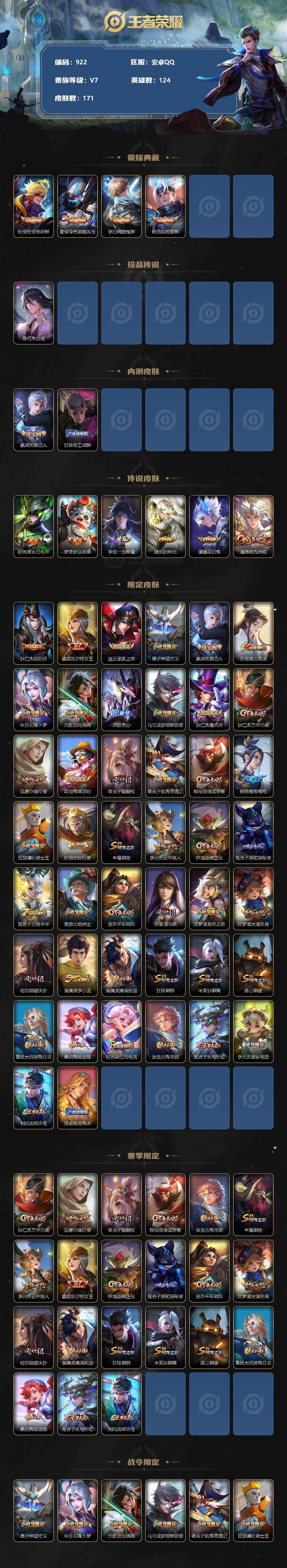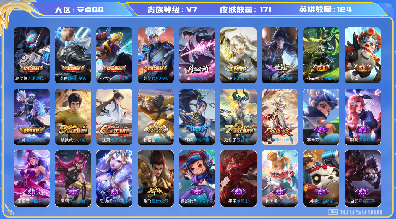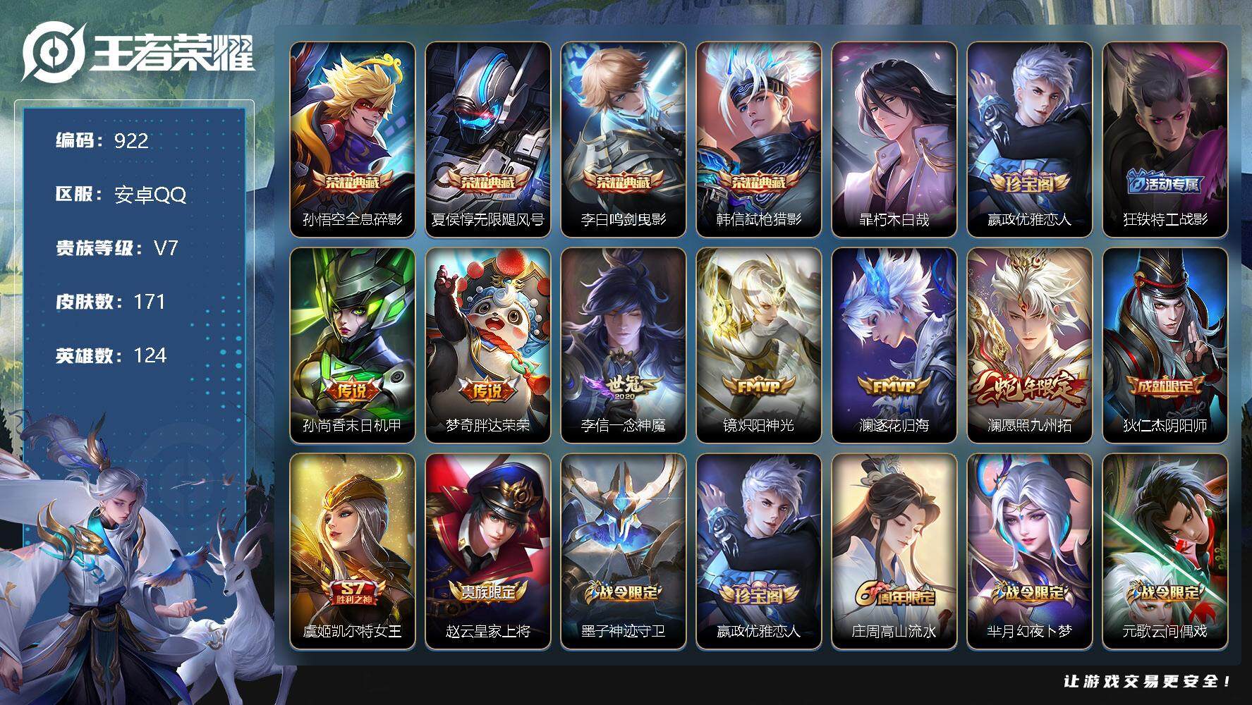 [10959901]【商品标题】:安卓Q-V7-最强王者段位-124英雄-171皮肤-4典藏-0珍品无双-0无双-1珍品传说-6传说-47史诗