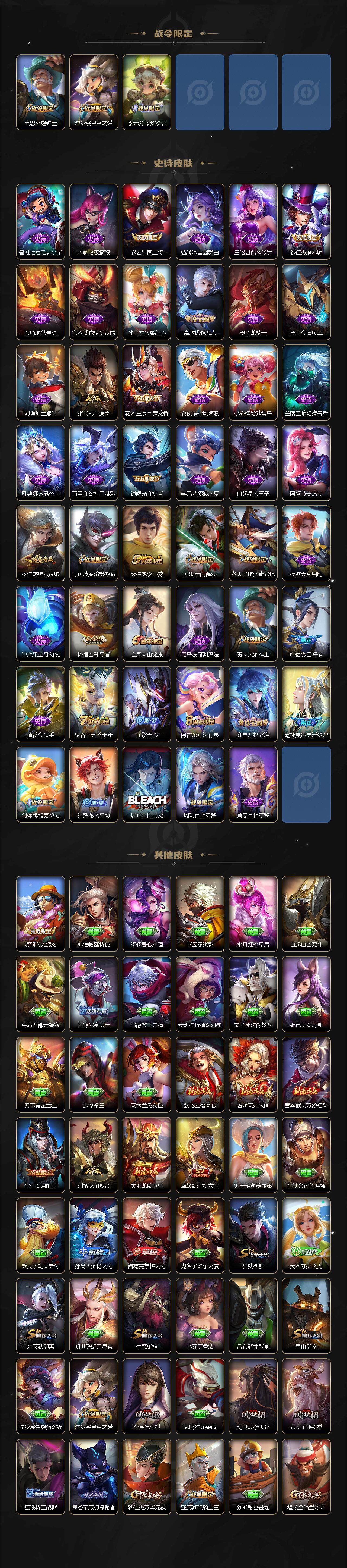 【史诗皮肤】:鲁班七号电玩小子,阿轲暗夜猫娘,赵云皇家上将,甄姬冰雪圆舞曲,王昭君偶像歌手,狄仁杰魔术师,廉颇地狱岩魂,宫本武藏鬼剑武藏,孙尚香水果甜心,嬴政优雅恋人,墨子龙骑士,墨子金属风暴,刘禅绅士熊喵,张飞乱世虎臣,花木兰水晶猎龙者,夏侯惇乘风破浪,小乔缤纷独角兽,兰陵王暗隐猎兽者,雅典娜冰冠公主,百里守约特工魅影,铠曙光守护者,李元芳逐浪之夏,白起星夜王子,阿轲节奏热浪,狄仁杰鹰眼统帅,马可波罗暗影游猎,裴擒虎李小龙,元歌云间偶戏,老夫子航海奇遇记,杨戬天秀启明,钟馗乐园奇幻夜,孙悟空孙行