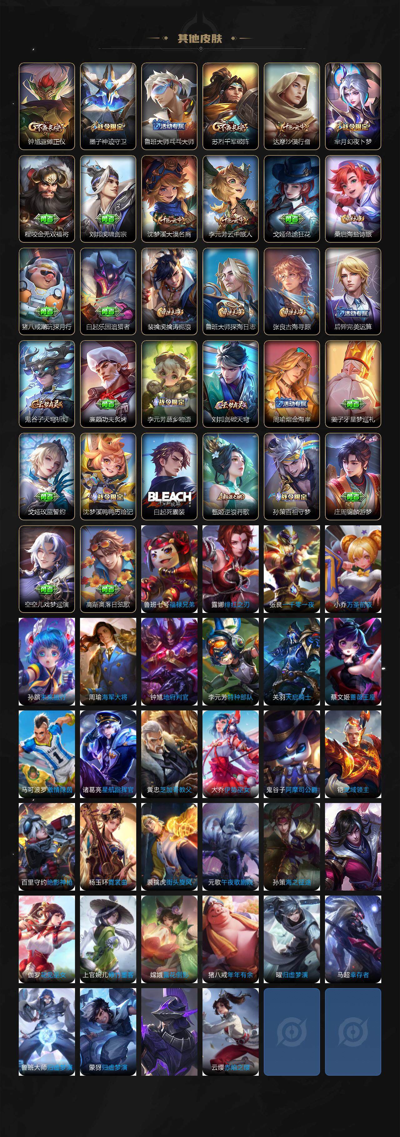 - PX_2106399-Q/至尊星耀/374皮肤/125英雄/3典藏/0珍品无双/1无双/1珍品传说/29传说/103史诗/9稀有英雄 【1 珍品传说】朽木白哉 暃, 【3 典藏皮肤】鸣剑·曳影 李白,九霄神辉 花木兰,大秦宣太后 芈月, 【1 无双皮肤】器灵·螭龙剑 曜, 【29 传说皮肤】永恒水手月亮 王昭君,启明星使 虞姬,无双飞将 马超,白虎志 百里玄策,李逍遥 曜,零号·赤焰 孙悟空,地