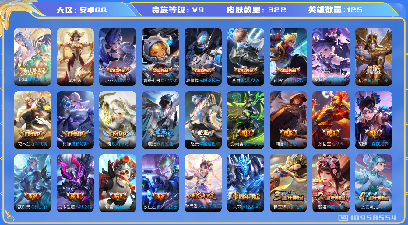 [10958554]【商品标题】:安卓Q-V9-至尊星耀III段位-125英雄-322皮肤-5典藏-1珍品无双-0无双-1珍品传说-23传说-90史诗