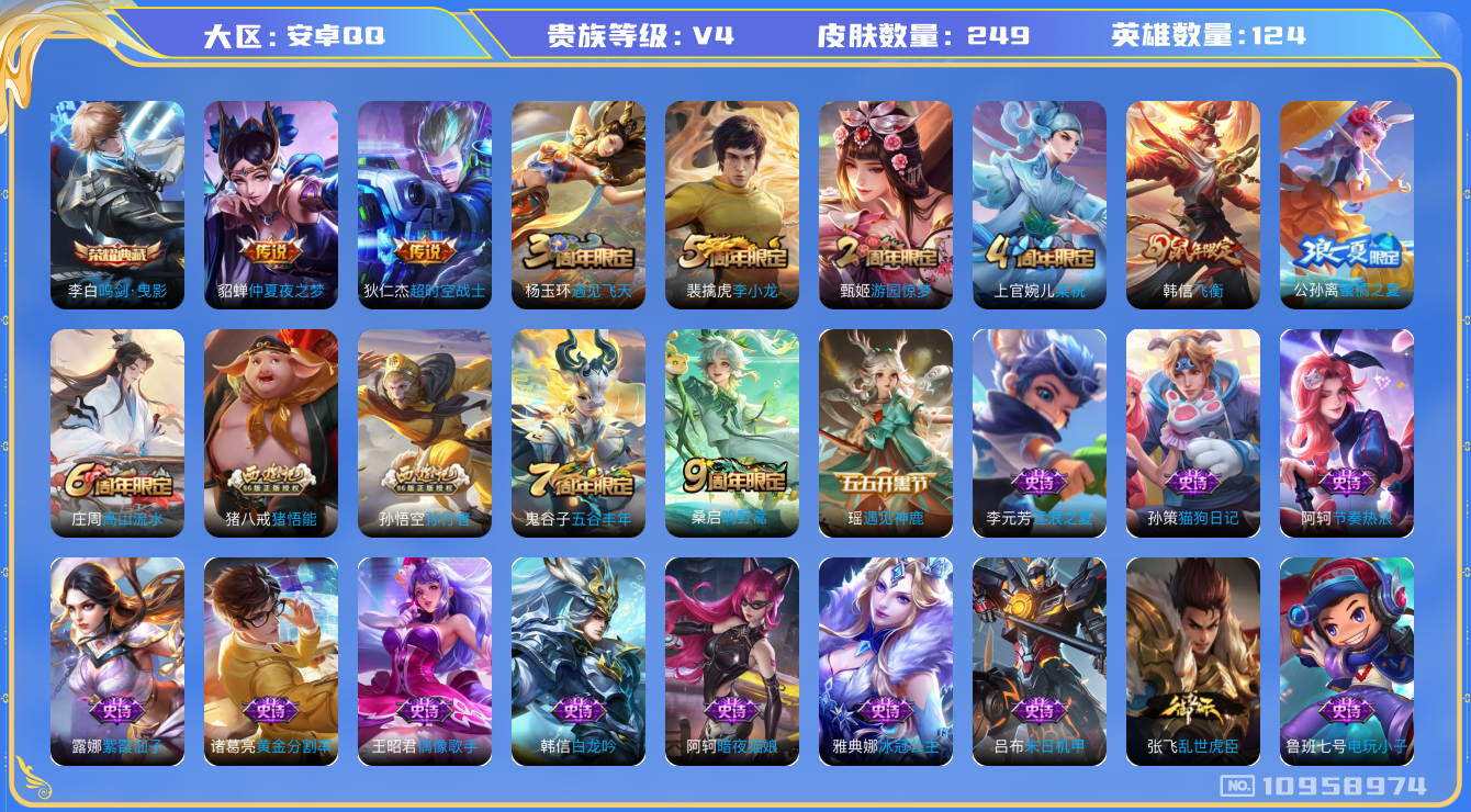 [10958974]【商品标题】:安卓Q-V4-荣耀黄金II段位-124英雄-249皮肤-1典藏-0珍品无双-0无双-0珍品传说-3传说-68史诗