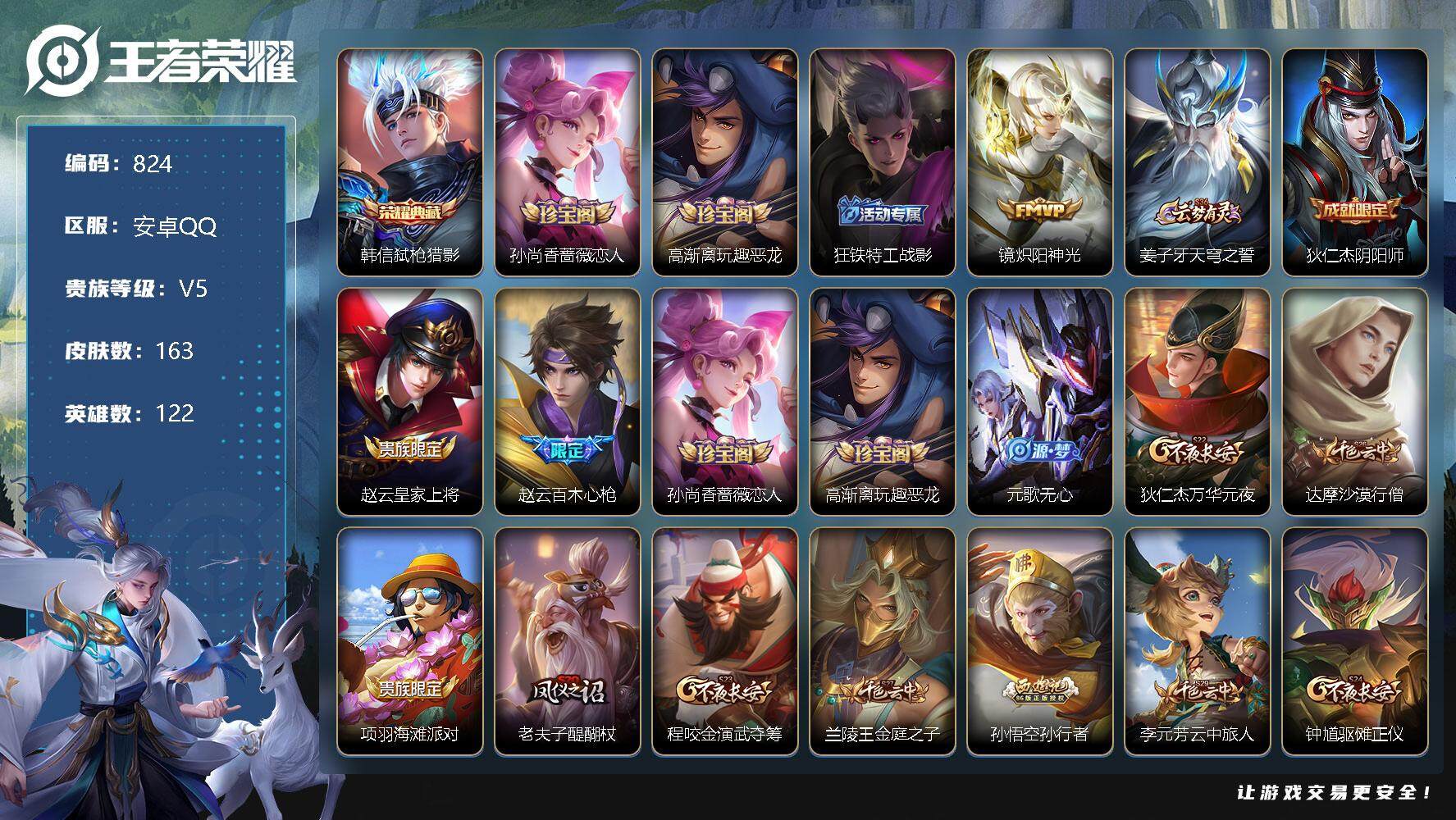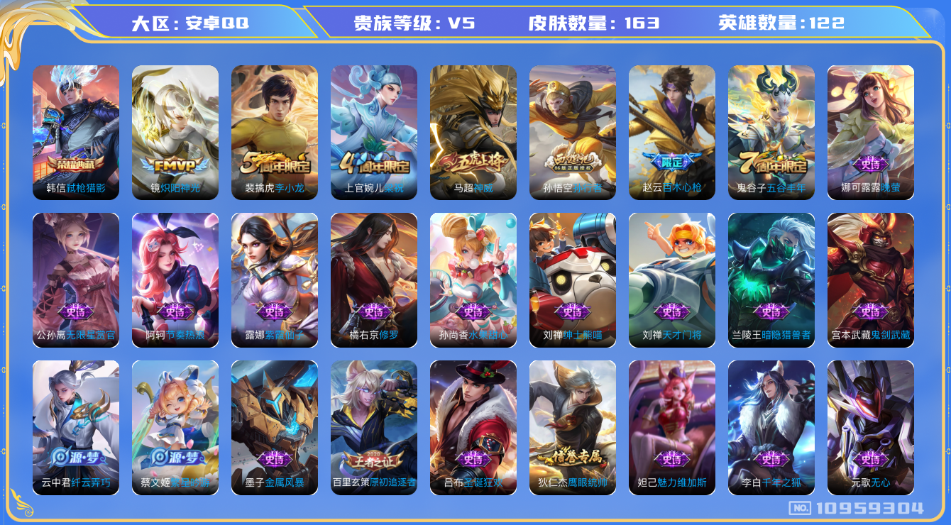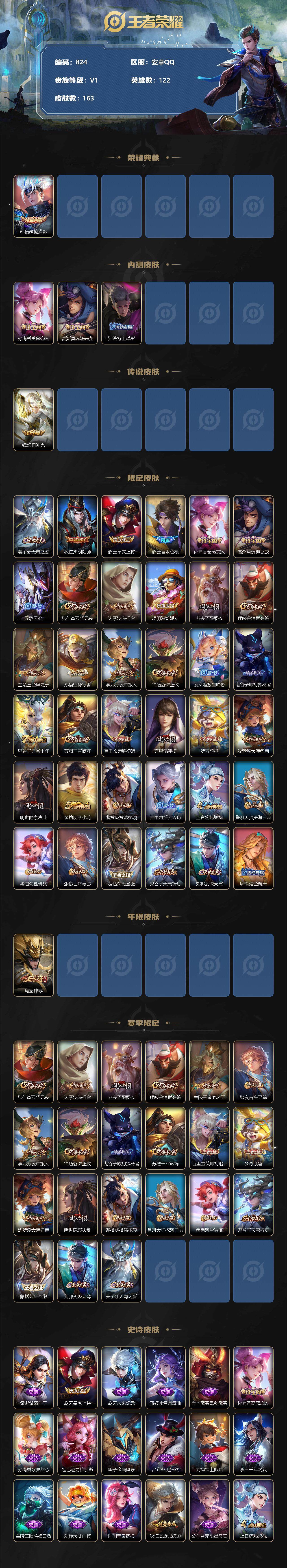 [10959304]【商品标题】:安卓Q-V1-至尊星耀IV段位-122英雄-163皮肤-1典藏-0珍品无双-0无双-0珍品传说-1传说-32史诗