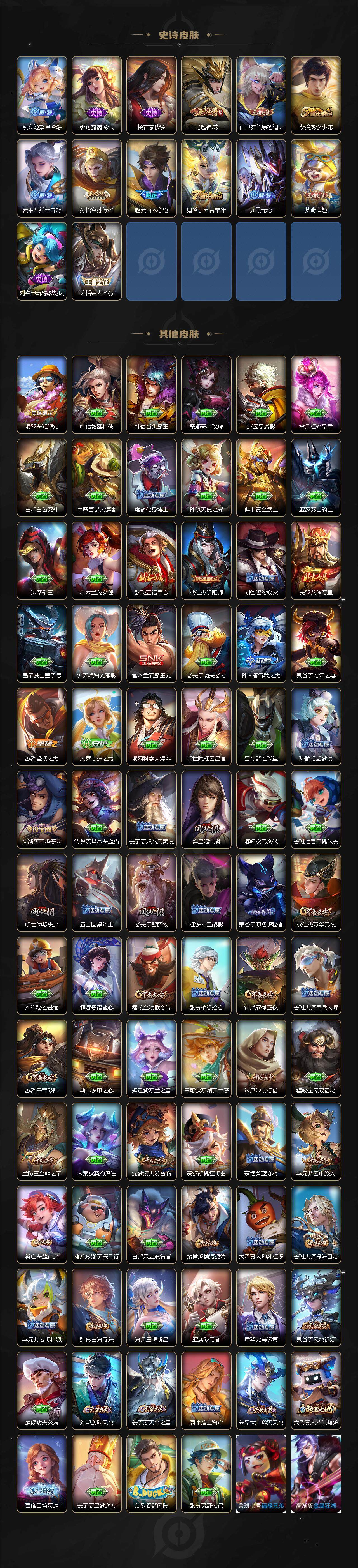 【史诗皮肤】:露娜紫霞仙子,赵云皇家上将,赵云未来纪元,甄姬冰雪圆舞曲,宫本武藏鬼剑武藏,孙尚香蔷薇恋人,孙尚香水果甜心,妲己魅力维加斯,墨子金属风暴,吕布圣诞狂欢,刘禅绅士熊喵,李白千年之狐,兰陵王暗隐猎兽者,刘禅天才门将,阿轲节奏热浪,狄仁杰鹰眼统帅,公孙离无限星赏官,上官婉儿梁祝,蔡文姬繁星吟游,娜可露露晚萤,橘右京修罗,马超神威,百里玄策原初追逐者,裴擒虎李小龙,云中君纤云弄巧,孙悟空孙行者,赵云百木心枪,鬼谷子五谷丰年,元歌无心,梦奇顽趣,刘禅电玩爆裂旋风,蒙恬荣光圣徽