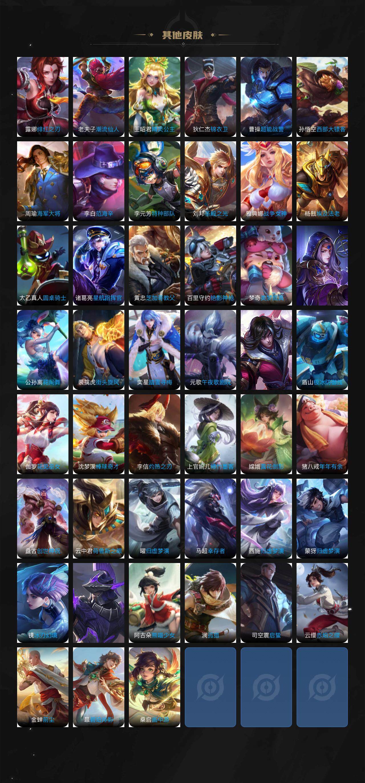 【其他皮肤】:项羽海滩派对,韩信教廷特使,韩信街头霸王,露娜哥特玫瑰,赵云忍炎影,芈月红桃皇后,白起白色死神,牛魔西部大镖客,扁鹊化身博士,孙膑天使之翼,典韦黄金武士,亚瑟死亡骑士,达摩拳王,花木兰兔女郎,张飞五福同心,狄仁杰阴阳师,刘备纽约教父,关羽龙腾万里,墨子进击墨子号,钟无艳海滩丽影,宫本武藏霸王丸,老夫子功夫老勺,孙尚香沉稳之力,鬼谷子幻乐