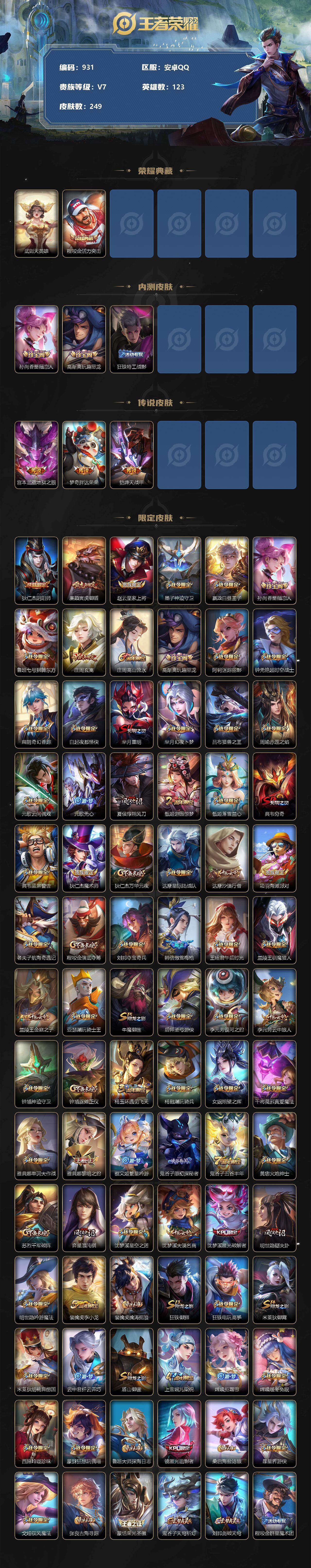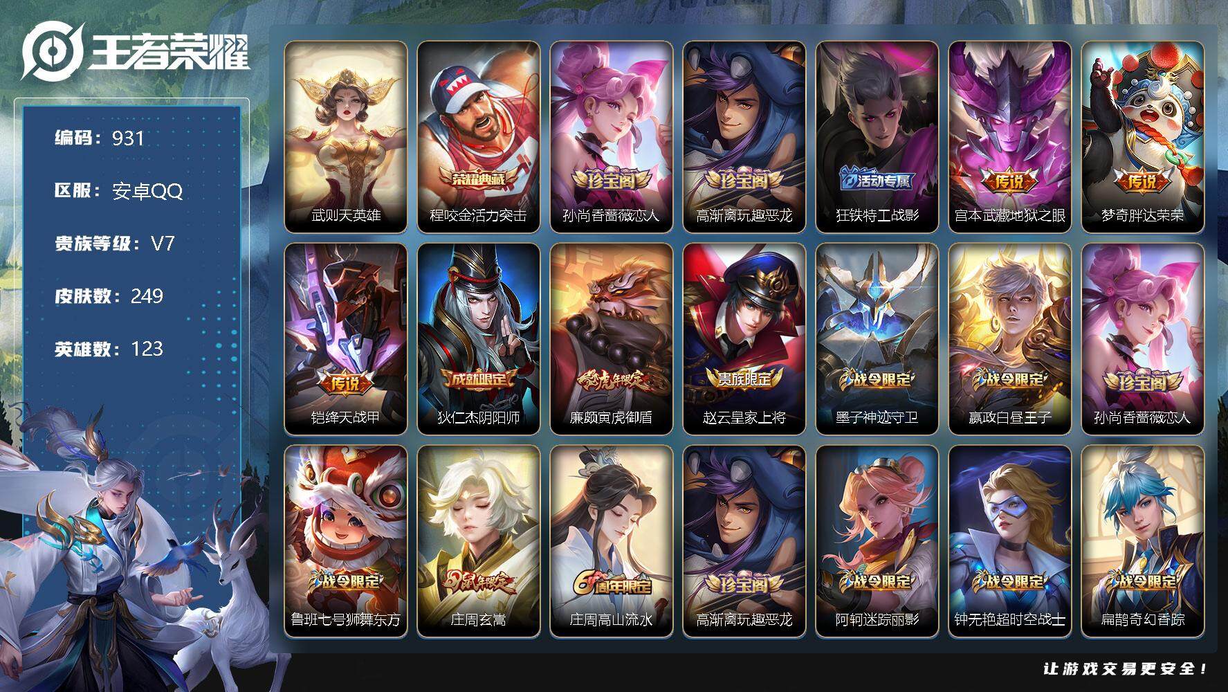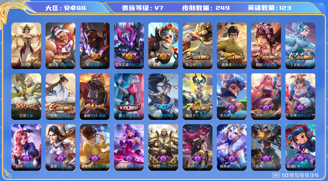 [10959934]【商品标题】:安卓Q-V5-至尊星耀II段位-123英雄-249皮肤-1典藏-0珍品无双-0无双-0珍品传说-3传说-77史诗
