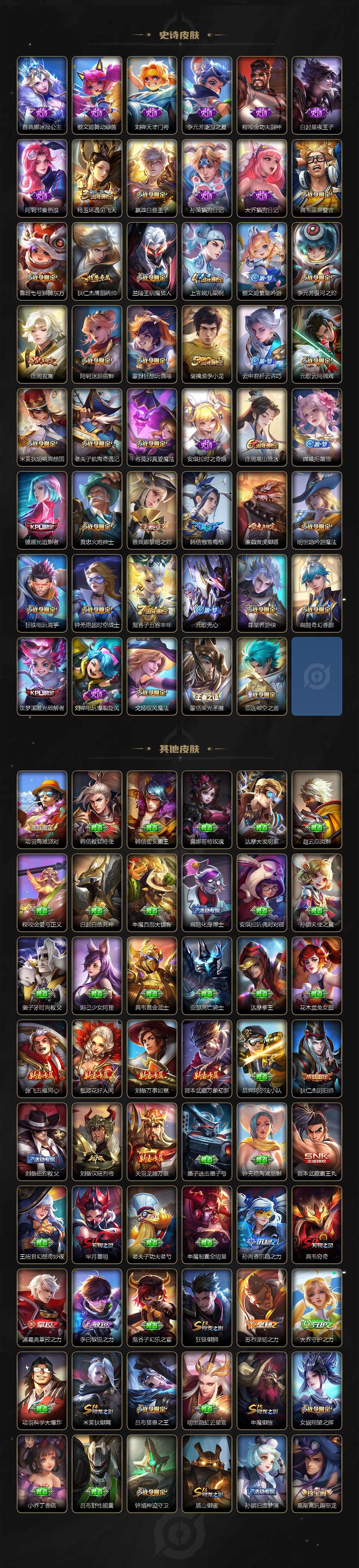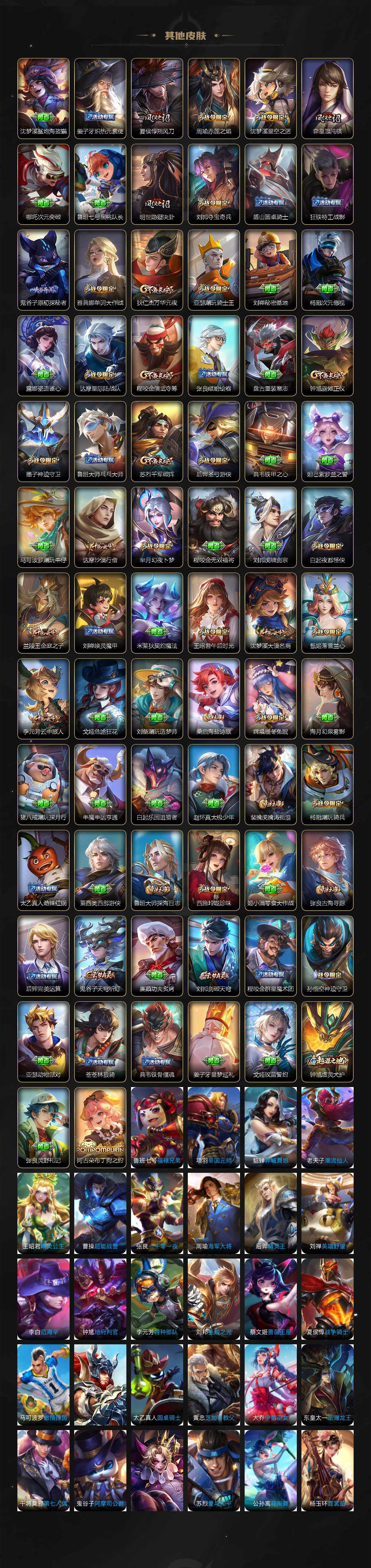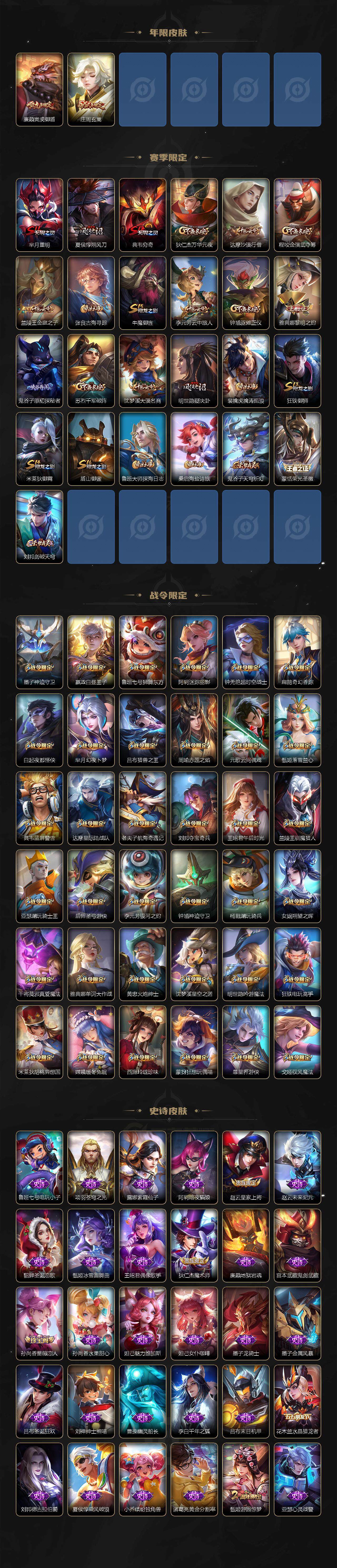 【限定皮肤】:狄仁杰阴阳师,廉颇寅虎御盾,赵云皇家上将,墨子神迹守卫,嬴政白昼王子,孙尚香蔷薇恋人,鲁班七号狮舞东方,庄周玄嵩,庄周高山流水,高渐离玩趣恶龙,阿轲迷踪丽影,钟无艳超时空战士,扁鹊奇幻香踪,白起夜都怪侠,芈月重明,芈月幻夜卜梦,吕布猎兽之王,周瑜赤莲之焰,元歌云间偶戏,元歌无心,夏侯惇朔风刀,甄姬游园惊梦,甄姬落雪兰心,典韦穷奇,典韦蓝屏警告,狄仁杰魔术师,狄仁杰万华元夜,达摩星际陆战队,达摩沙漠行僧,项羽海滩派对,老夫子航海奇遇记,程咬金演武夺筹,刘邦夺宝奇兵,韩信傲雪梅枪,王昭君午后时光,兰陵王驯魔猎人,兰陵王金庭之子,亚瑟潮玩骑士王,牛魔御旌,后羿圣弓游侠,李元芳银河之约,李元芳云中旅人,钟馗神迹守卫,钟馗驱傩正仪,杨玉环遇见飞天,杨戬潮玩骑兵,女娲朔望之晖,干将莫邪真爱魔法,雅典娜单词大作战,雅典娜黎明之约,蔡文姬繁星吟游,鬼谷子原初探秘者,鬼谷子五谷丰年,黄忠火炮绅士,苏烈千军破阵,弈星混沌棋,沈梦溪星空之诺,沈梦溪大漠名商,沈梦溪匿光破解者,明世隐疑决卦,明世隐吟游魔法,裴擒虎李小龙,裴擒虎擒涛扼浪,狂铁御狮,狂铁电玩高手,米莱狄御霄,米莱狄胡桃异想国,云中君纤云弄巧,盾山御銮,上官婉儿梁祝,嫦娥拒霜思,嫦娥暖冬兔眠,西施玲珑珍味,蒙犽狂想玩偶喵,鲁班大师探海日志,镜匿光追影者,桑启海盐诗旅,暃星界游侠,戈娅驭风魔法,张良古海寻踪,蒙恬荣光圣徽,鬼谷子天穹祈灯,刘邦剑破天穹,程咬金群星魔术团