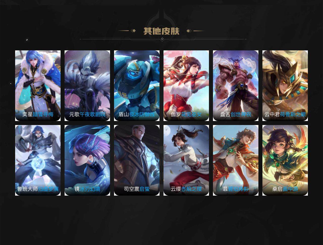 芈月重明,典韦穷奇,狂铁御狮,米莱狄御霄,牛魔御旌,盾山御銮,夏侯惇朔风刀,明世隐疑决卦,鬼谷子原初探秘者,狄仁杰万华元夜,程咬金演武夺筹,钟馗驱傩正仪,苏烈千军破阵,吕布猎兽之王,嬴政白昼王子,女娲朔望之晖,典韦蓝屏警告,钟馗神迹守卫,鲁班七号狮舞东方,沈梦溪星空之诺,李元芳银河之约,刘邦夺宝奇兵,蒙犽狂想玩偶喵,元歌云间偶戏,弈星混沌棋,达摩沙漠行僧,兰陵王金庭之子,沈梦溪大漠名商,李元芳云中旅人,桑启海盐诗旅,裴擒虎擒涛扼浪,鲁班大师探海日志,张良古海寻踪