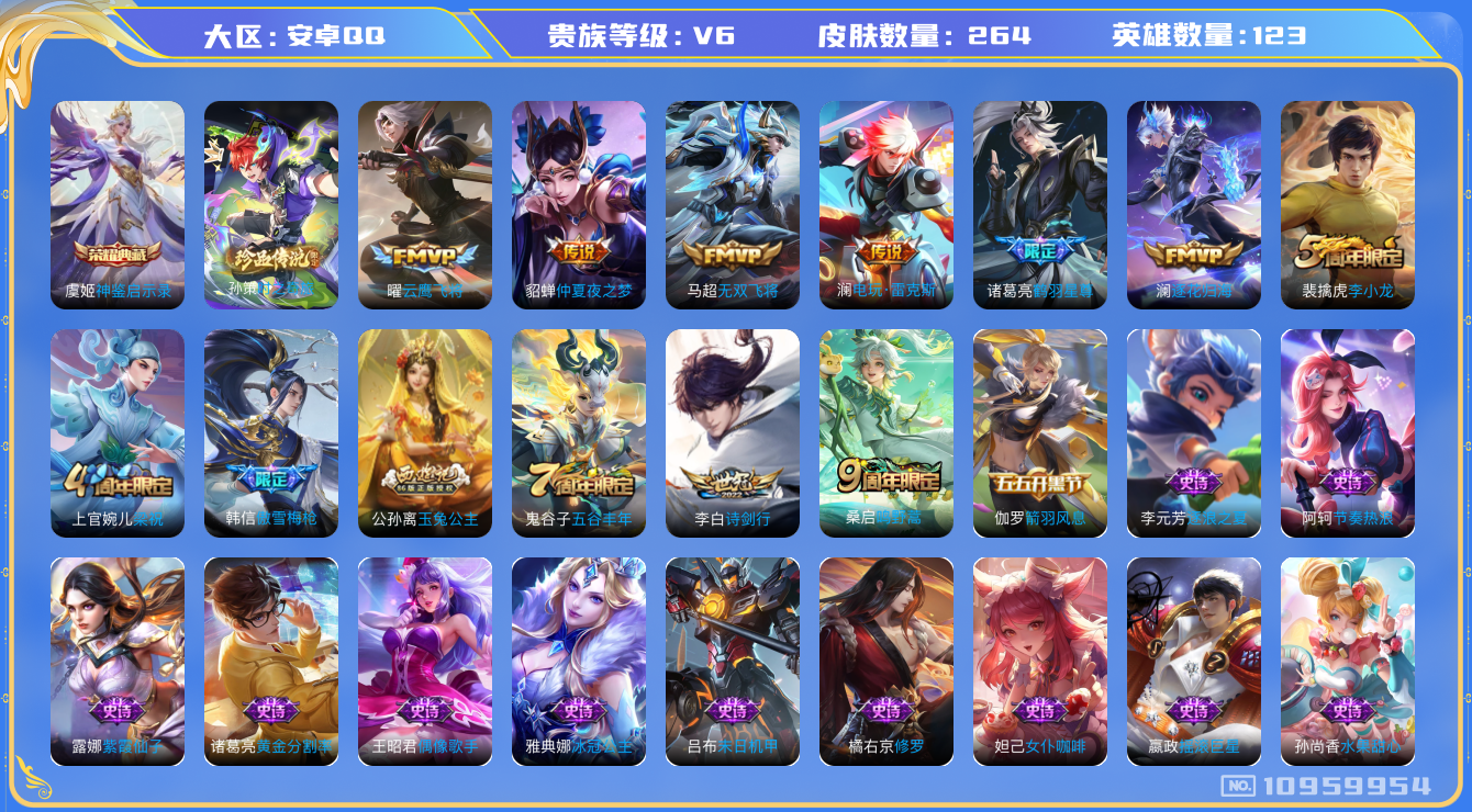 [10959954]【商品标题】:安卓Q-V6-永恒钻石I段位-123英雄-264皮肤-1典藏-0珍品无双-0无双-1珍品传说-8传说-71史诗