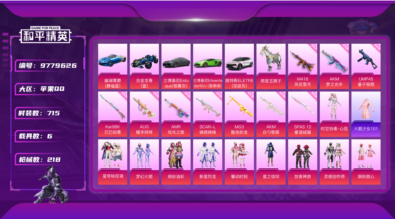 [9779626]实名: 可修改 时装数: 715 载具数: 6 枪械数: 218 战备数: 173 热门装扮: 火箭少女101(老101),梦幻火箭(新101),呆萌铁蟹,深海小丑鱼,星之信仰,梦魇先生,放客神游,万圣娃娃,迅捷狂鲨,鹰眼刺客,缤纷油彩,新星烈龙,馨动时刻,灵感创作师,胖达圆圆,飒粉甜心,小可学妹,呆萌星弥,未来歌姬,拂晓神骑,炫光之旅,水仙星,勇猛狮王,双面双生,室女星神,宙之时溯,傲傲奶龙,冰炎战车,圣堂之誓,小叽联名款,电磁星,创世·救赎,时空协奏·心弦,星穹咏叹调 载具: 合金龙骨(蓝),兰博基尼Estoque(银翼灰),兰博基尼Aventador SVJ(翡翠绿),路特斯ELETRE(花绽灰),照夜玉狮子,幽澜尊爵(静谧蓝) 稀有枪皮: AKM梦之光华,M416风花雪月,AKM白勺歌姬,AMR炫光之旅,MG3酷泡奶龙,SCAR-L-锦绣绵绵,SPAS-12蜜语绒猫,UMP45量子极限,Kar98K-巳巳如意,AUG-暖羊咩咩