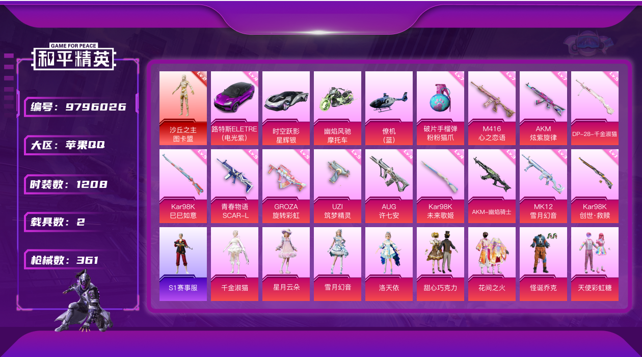 1🎀31👗13🔫2🚗1✈️实名: 可修改 时装数: 1208 载具数: 2 枪械数: 361 战备数: 310 神级装扮: 沙丘之主-图卡盟 热门装扮: 甜心巧克力,呆萌铁蟹,怪诞乔克,深海小丑鱼,宝贝奶油派,天使彩虹糖,梦魇先生,放客神游,万圣娃娃,迅捷狂鲨,鹰眼刺客,缤纷油彩,好奇恐龙,都市猎人,草莓生巧,花间之火,冰霜白皇,童趣迷兔,星空之魅,甜梦冰蝶,馨动时刻,暗夜玫瑰,洛天依,岚岚物语,甜梦小狐,橘柚倾心,寒光使者,暖熊萌萌,S1赛事上衣,潮萌小黄鸭,恶魔喵喵,激萌罗小黑,萌神柯基,奶芙汪汪,胖达团团,胖达圆圆,兔兔白日梦,派对舞王,仲夏莫吉托,飒粉甜心,呆萌星弥,憨憨奶龙,圣堂之誓,蜜语绒猫,美雪,金丰海韵,S1赛事套装,千金淑猫,星月云朵,雪月幻音 载具: 空客H135-蔚蓝之翼,时空跃影(星辉银),幽焰风驰摩托车 稀有枪皮: AKM炫紫旋律,M416心之恋语,SCAR-L青春物语,UZI筑梦精灵,GROZA旋转彩虹,Kar98K未来歌姬,破片手榴弹粉粉猫爪,Kar98K创世·救赎,AKM-幽焰骑士,DP-28-千金淑猫,AUG-许七安,Kar98K-巳巳如意,MK12-雪月幻音