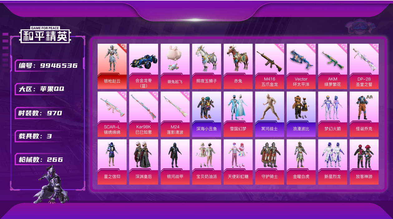 [9946536]苹果q-有二次-战神框-绝世印记-73级收藏家-赵云-金迪迦-红螳螂-小丑-冰雪-天网-木乃伊-都市-赤蝎-金鞋-火箭少女-LED眼罩-赤兔马-玉狮子-24粉装-3特效枪-3满级-3载具-1飞机