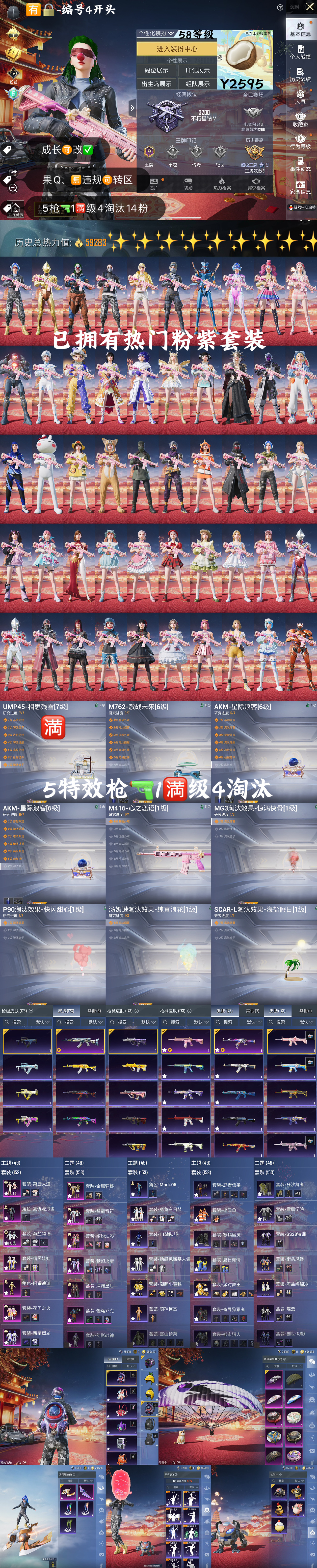 - [12002514]2粉装 7特效枪 8印记 可二次 可修改实名 优质装备:M416五爪金龙,奇异狩猎者,数码大师,七级M416-五爪金龙,GROZA-镜光银凌,AUG-暖羊咩咩,雪月幻音,AMR-智耀战神,MK14-甜梦熊击,Kar98K-巳巳如意 热门装扮:大橘为重,万圣娃娃,梦魇先生 稀有枪皮:DP-28-豹影疾电 五级特效枪:五级GROZA-镜光银凌,五级Kar98K-巳巳如意,五级DP-28-豹影疾电,五级MK14-甜梦熊击,五级AUG-暖羊咩咩 三级特效枪:三级AMR-智耀战神 紫色装扮:田园牧歌,轻风白浪,SS22特训,SS23特训,娇憨猪猪,萌趣咩咩,SS21特训,绚烂繁星,SS31特训套装,SS3特训,SS4特训,SS5特训,军械专家,冰原使者,,冰川特警,冷焰舞者,凛冬战士,北国孤狼,SS30特训套装,SS33特训套装,SS15特训,双棍侠客,时空追击者,暴风机械师,SS16特训,遗落祭司,SS13特训,SS14特训,特种颜团子,吉莉礼服,瑞龙福将,团圆交子,SS17特训,冰川谧蓝,异彩先驱,SS18特训,金鼠迎春,长空猛禽,雪山征服者,雪山精英,霓虹极客,霓虹街区,迎春赐吉,缤纷果语,耀眼新星,蓝彩潮人,蓝色守护者,蓝色运动,虎虎生威吉莉,超能勇士,风行保卫者,飞行日记,龙腾端午,骑行爱好者,魅力单车,麻辣教官,黄色伏地魔,黄色名流,黄色格斗者,黄色运动,黑色伏地魔,龟仙人,香桃花海,极速红龙,格斗先锋,沙漠兵团,深蓝色名流,滨海假日,幻影武者,圣诞大吉,坚韧舞者,夜莺强袭者,战地督导,战地菁英,滨海厨神,疯狂小兔子,白色伏地魔,破晓战魂,破蛋小黄鸡,神秘领域,甜蜜告白,福星高照,空投萌叽,竞技勇士朋克,红色运动,甜蜜熊情侣,牛气冲天,灰色格斗者,热血青春,热血骑手,牛气满满,猛禽,特战装甲,狂沙舞者,猎鹰,小熊娃娃,雏菊兔兔,萝兰蝴蝶,SS29特训,星途旅人,火种守护者(套装-火种守卫者),鱼渊荷华,燕燕于飞,巳巳如意,青团波波,糖糖葫芦,棉花软糖,竞技名士,SS24特训(SS24特训套装),SS25特训,粉红小猪,SS27特训,金羽特工,SS26特训,智谋强哥,精神漫游,SS6特训,核芯基因,SS7特训,深蓝冒险家,迷域探索者,黑夜传说,淡雅花蕊,SS8特训,幻世猎手,大橘大利,原初圣火,逆风勇士,SS12特训,众神之王,智慧之神,SS9特训,红酒骑士,风华