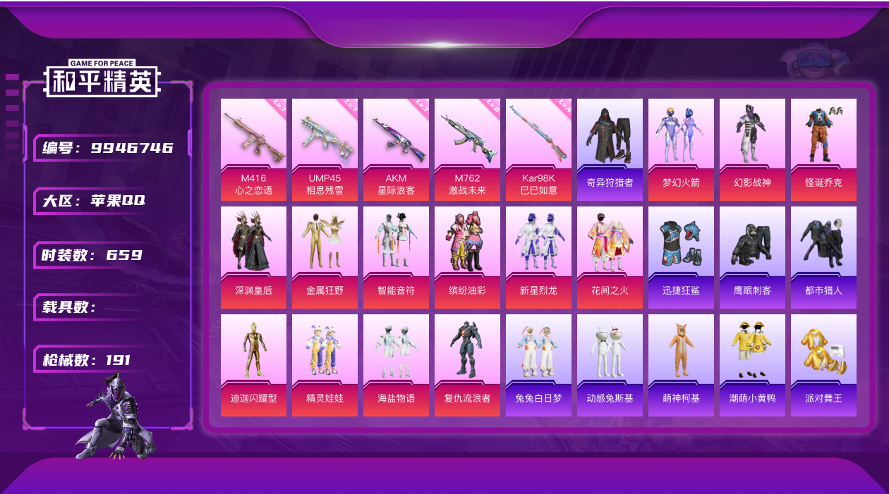 [9946746]苹果q-有二次-小丑-金迪迦-都市猎人-寒蝎-小金鞋-蓝螳螂-第五大道-火箭少女-花间之火-智能音符-小丑鱼-兔斯基-小黄鸭-满级相思残雪UMP-菠萝头盔-14粉装-5特效枪-1满级