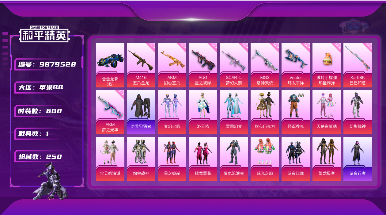 [9879528]实名: 可修改 时装数: 688 载具数: 1 枪械数: 250 战备数: 152 热门装扮: 奇异狩猎者,梦幻火箭(新101),幻影战神,甜心巧克力,呆萌铁蟹,怪诞乔克,宝贝奶油派,天使彩虹糖,万圣娃娃,迅捷狂鲨,鹰眼刺客,都市猎人,绚金战神,雪国幻梦,星之彼岸,蝶舞蔷薇,暗夜玫瑰,洛天依,复仇流浪者,暗夜行者,赤蝎幽灵,寒蝎幽灵,派对舞王,炫光之旅,繁龙极客 载具: 合金龙骨(蓝) 稀有枪皮: MG3洛神天依,M416五爪金龙,SCAR-L梦幻火箭,AKM甜心宝贝,AUG星之彼岸,AKM梦之光华,Vector环太平洋,Kar98K-巳巳如意,破片手榴弹-热量炸弹