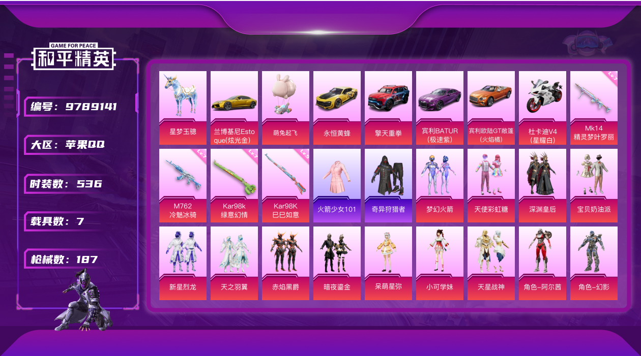[9789141]实名: 可修改 时装数: 536 载具数: 7 枪械数: 187 战备数: 139 热门装扮: 火箭少女101(老101),奇异狩猎者,梦幻火箭(新101),呆萌铁蟹,深渊皇后,宝贝奶油派,天使彩虹糖,东方飞龙,新星烈龙,天之羽翼,赤焰黑爵,蔷薇魔法师,暗夜鎏金,银碳小老虎,小可学妹,呆萌星弥,天星战神,大黄蜂,幻影,阿尔茜,严莉莉,美雪,美琪,小蓝,星梦奇缘 载具: 兰博基尼Estoque(炫光金),僚机-萌兔起飞,擎天重拳,永恒黄蜂,宾利BATUR(极速紫),宾利欧陆GT敞篷(火焰橘),杜卡迪 Panigale V4(星耀白),星梦玉骢 稀有枪皮: Kar98k绿意幻情,M762冷魅冰骑,Mk14精灵梦叶罗丽,Kar98K-巳巳如意