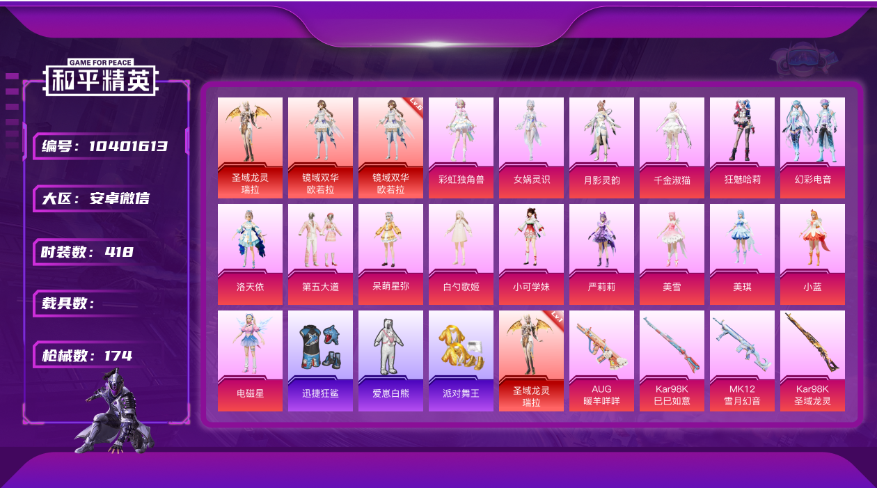 [10401613]实名: 可修改 时装数: 418 枪械数: 174 战备数: 126 神级装扮: 镜域双华-欧若拉,圣域龙灵-瑞拉 热门装扮: 迅捷狂鲨,爱崽白熊,洛天依,派对舞王,第五大道,小可学妹,白勺歌姬,呆萌星弥,严莉莉,美雪,美琪,小蓝,电磁星,千金淑猫,月影灵韵,女娲灵识,彩虹独角兽,幻彩电音,狂魅哈莉 稀有枪皮: MG3洛神天依,M416风花雪月,SCAR-L-锦绣绵绵,M24镜域双华,M416电玩时刻,UMP45量子极限,GROZA-镜光银凌,Kar98K-巳巳如意,AUG-暖羊咩咩,MK12-雪月幻音,Kar98K-圣域龙灵,MK14-甜梦熊击