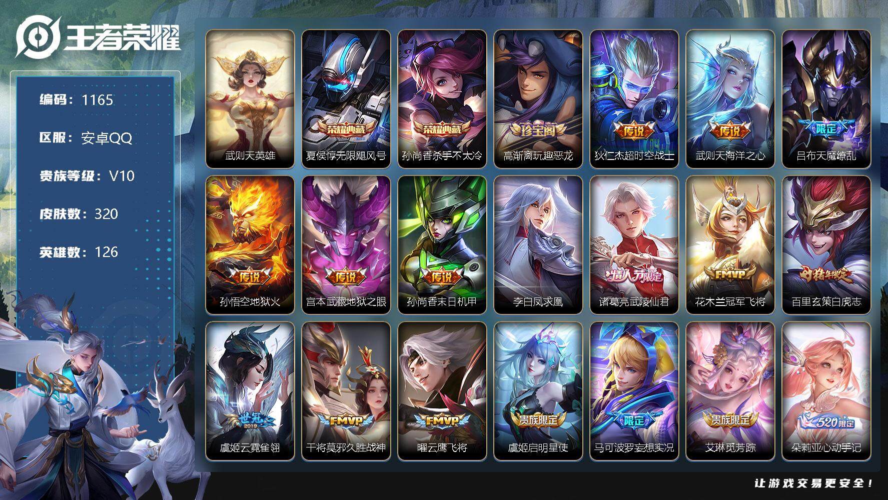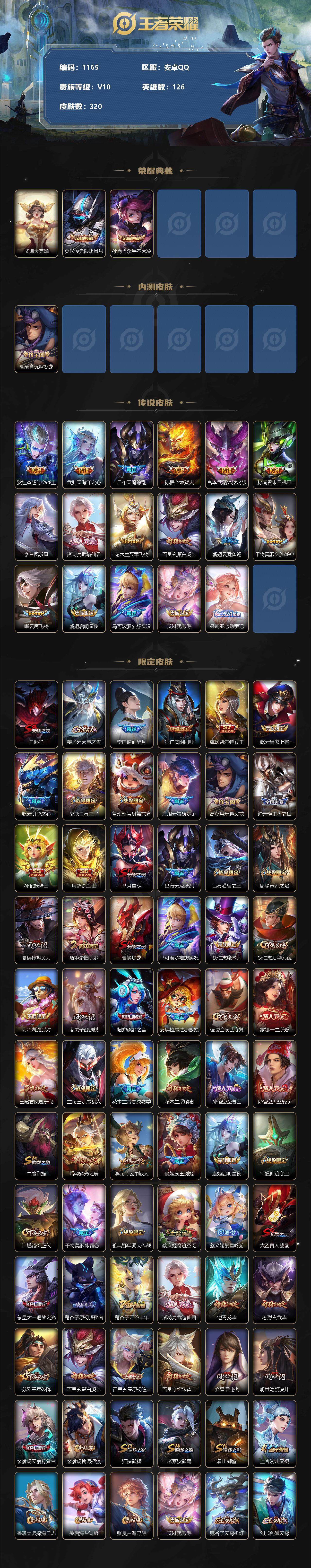 [11132814]【商品标题】:安卓Q-V10-至尊星耀II段位-126英雄-320皮肤-2典藏-0珍品无双-0无双-0珍品传说-17传说-84史诗
