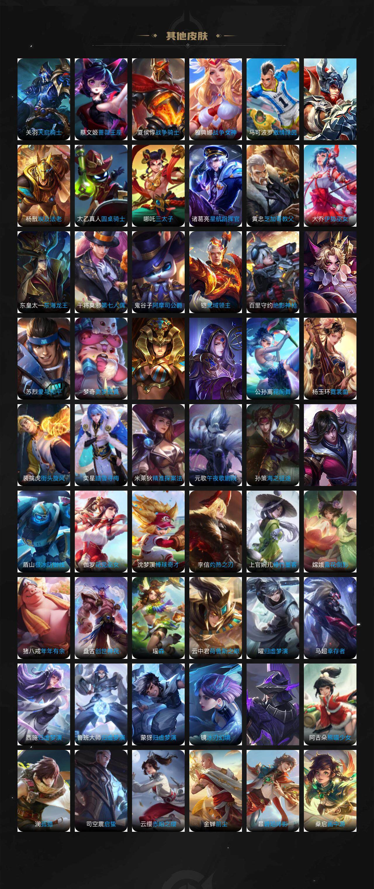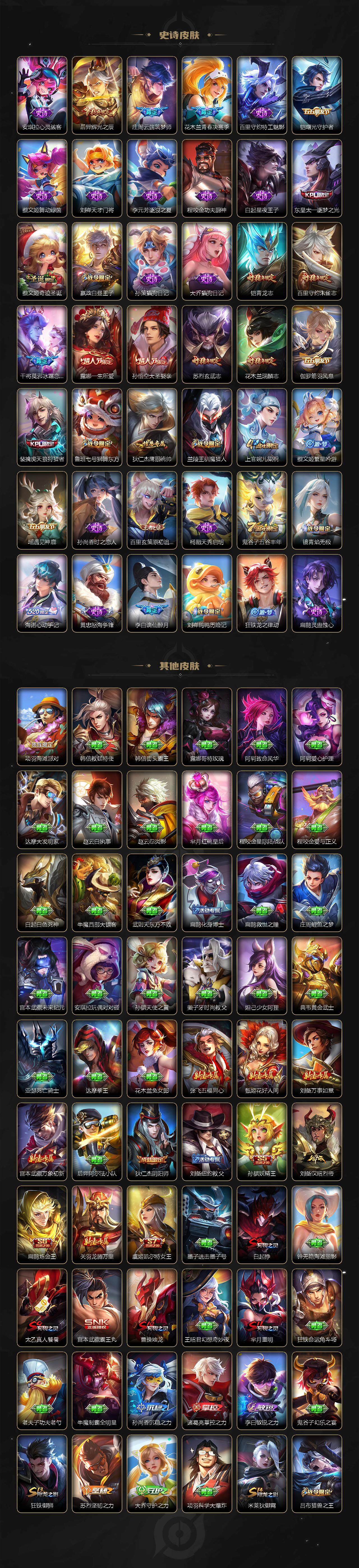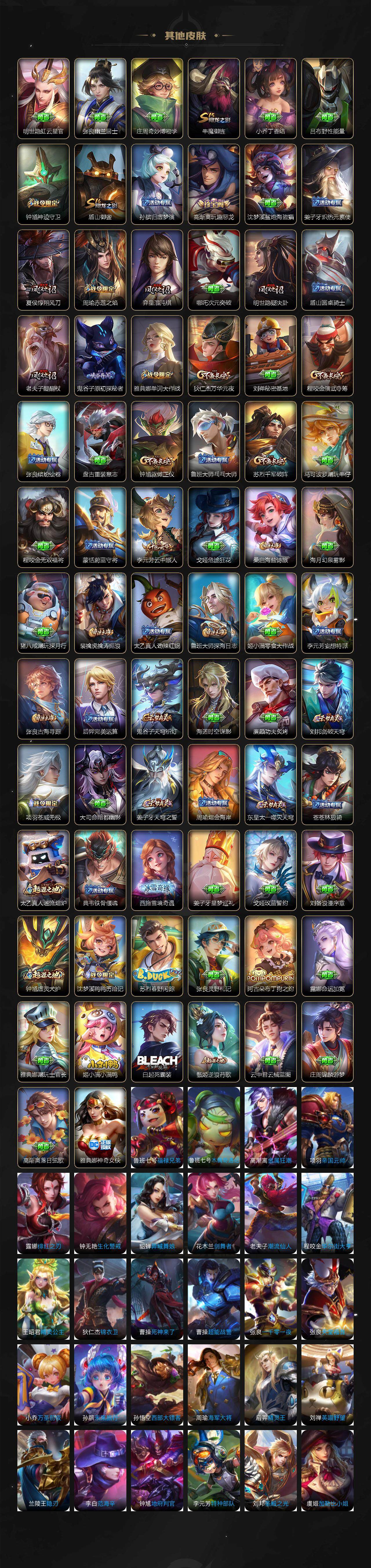 瑶遇见神鹿,伽罗箭羽风息,李元芳逐浪之夏,大乔猫狗日记,孙策猫狗日记,露娜紫霞仙子,诸葛亮黄金分割率,王昭君偶像歌手,韩信白龙吟,项羽苍穹之光,孙尚香时之恋人,阿轲暗夜猫娘,雅典娜冰冠公主,吕布末日机甲,鲁班七号电玩小子,墨子龙骑士,嬴政摇滚巨星,刘禅绅士熊喵,刘禅天才门将,白起星夜王子,安琪拉心灵骇客,程咬金功夫厨神,刘邦德古拉伯爵,兰陵王暗隐猎兽者,曹操幽灵船长,宫本武藏鬼剑武藏,亚瑟心灵战警,杨戬天秀·启明,蔡文姬舞动绿茵,廉颇地狱岩魂,小乔缤纷独角兽,夏侯惇乘风破浪,花木兰水晶猎龙者,铠曙光守护者,墨子金属风暴,百里玄策原初追逐者,吕布圣诞狂欢,貂蝉圣诞恋歌,百里守约特工魅影,嬴政暗夜贵公子,李白千年之狐,海诺心动手记,李白谪仙醉月