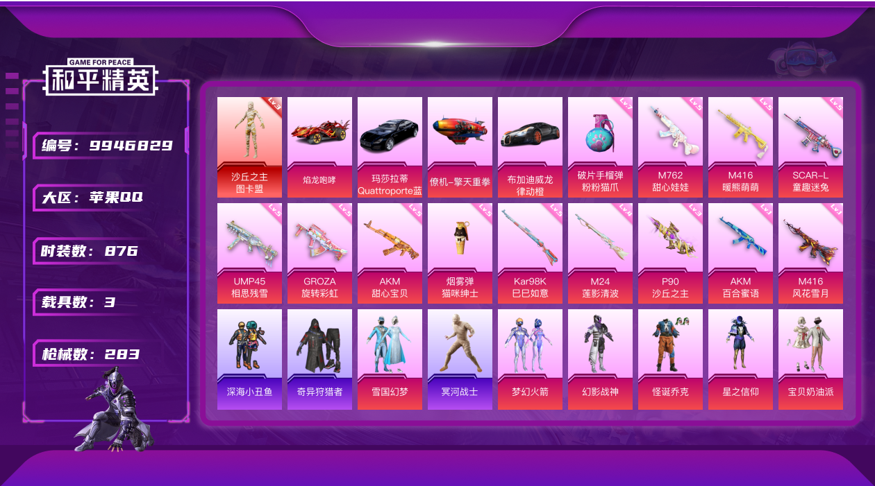 - [11355234]WBDS0061 苹果Q 148套装 176枪皮 1神装25粉装9特效枪2载具 沙丘之主-图卡盟 (1级) M416-超新星 (9级) 宾利BATUR(极速紫) 越野奶龙龙 赤蝎幽灵 AKM-缤纷海域 浪漫天命 圣堂之誓 梦幻火箭 雪国幻梦 赵灵儿 蔷薇星 白兰星 茉莉星 憨憨奶龙 天使彩虹糖 小叽联名款 怪诞乔克 镜光幻境 酣梦娃娃 缤纷油彩 放客神游 心之回忆 新星烈龙 星空之魅 童趣迷兔 冰霜白皇 炙焰红王 暖熊萌萌 馨动时刻 音爆索尼克 海盐物语 SCAR-L-纯梦嫁纱 (4级) M416-心之恋语 (1级) P90-沙丘之主 (1级) Kar98K-巳巳如意 (5级) AKM-百合蜜语 (7级) MG3-酷泡奶龙 (2级) DP-28-豹影疾电 (5级) AUG-超新星 (4级) 梦幻火箭飞行器 镜光幻境飞行翼 萌物绒绒飞行器 龟仙人 动感兔斯基 潮萌小黄鸭 呆萌铁蟹 万圣娃娃 鹰眼刺客 兔兔白日梦 奶芙汪汪 恶魔喵喵 激萌罗小黑 胖达圆圆 胖达团团 暗影哥特 雪国精灵头盔 深海小丑鱼头盔 梦幻火箭背包 雪国精灵背包 甜心宝贝背包 深海小丑鱼背包