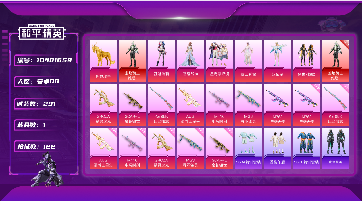 [10401659]实名: 可修改 时装数: 291 载具数: 1 枪械数: 122 战备数: 78 神级装扮: 幽焰骑士-维塔 热门装扮: 烟云彩露,超弦星,创世·救赎,智耀战神,星穹咏叹调,狂魅哈莉 载具: 护世瑞兽 稀有枪皮: M762-电糖天使,M416电玩时刻,GROZA-精灵之光,Kar98K-巳巳如意,SCAR-L金蛇镇世,AUG-圣斗士星矢,MG3-辉羽雀灵