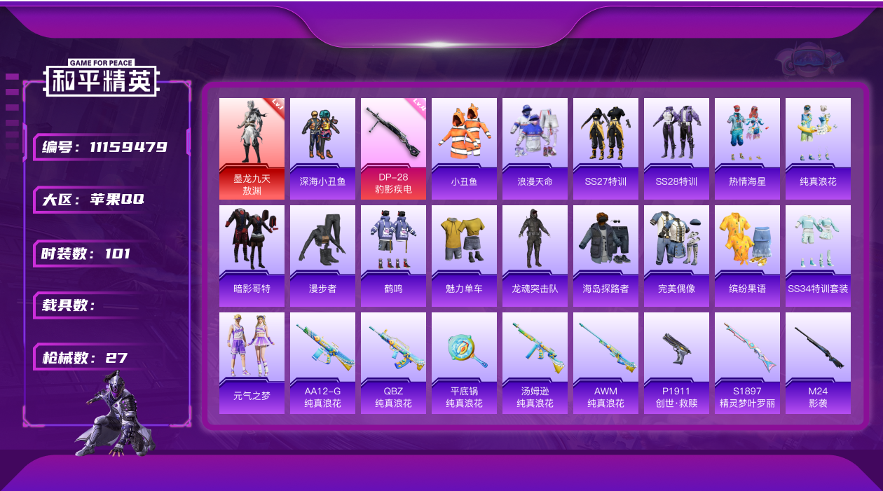 [11159479]实名: 可修改 时装数: 101 枪械数: 27 战备数: 20 神级装扮: 墨龙九天-敖渊 热门装扮: 深海小丑鱼 稀有枪皮: DP-28-豹影疾电
