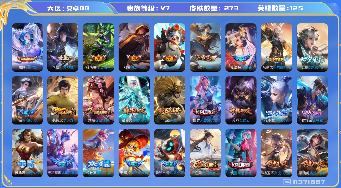 [11371667]【商品标题】:安卓Q-V5-至尊星耀IV段位-125英雄-272皮肤-1典藏-0珍品无双-0无双-0珍品传说-16传说-96史诗