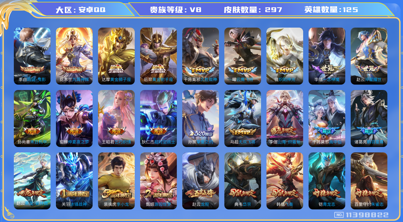[11398822]【商品标题】:安卓Q-V8-永恒钻石I段位-125英雄-297皮肤-2典藏-0珍品无双-0无双-0珍品传说-23传说-93史诗