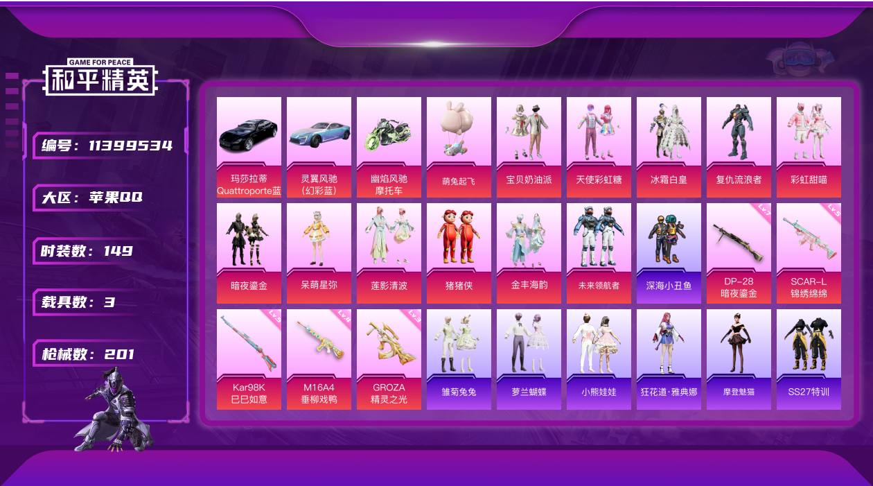 [11399534]【商品标题】:苹果 手Q-11粉装-5特效枪-3载具-66760热力值-8印记-149套装-201枪皮 【稀有载具】:玛莎拉蒂Quattroporte(夜幕蓝),灵翼风驰(幻彩蓝),幽焰风驰摩托车,僚机-萌兔起飞 【特效枪等级】:M16A4-垂柳戏鸭(四级),SCAR-L-锦绣绵绵(五级),GROZA-精灵之光(三级),Kar98K-巳巳如意(五级),DP-28-暗夜鎏金(七级) 【优质套装】:粉装-宝贝奶油派,粉装-天使彩虹糖,粉装-冰霜白皇,角色-复仇流浪者,粉装-彩虹甜喵,粉装-暗夜鎏金,角色-呆萌星弥,粉装-莲影清波,玩偶服-猪猪侠,粉装-金丰海韵,粉装-未来领航者 【稀有套装】:套装-龟仙人,套装-巳巳如意,套装-雏菊兔兔,套装-萝兰蝴蝶,套装-小熊娃娃,角色-狂花道·雅典娜,套装-火种守卫者,套装-糖糖葫芦,套装-青团波波,套装-棉花软糖,角色-摩登魅猫,套装-燕燕于飞,套装-鱼渊荷华 【优质武器皮肤】:M16A4-垂柳戏鸭,SCAR-L-锦绣绵绵,GROZA-精灵之光,Kar98K-巳巳如意,DP-28-暗夜鎏金 【稀有武器皮肤】:AKM-环太平洋,AKM-霓虹街区,M16A4-天使羽翼,M16A4-幻世战舞者,M16A4-甜心亚梦,M16A4-红色方程式,M16A4-蓝色火焰,M16A4-千金淑猫,SCAR-L-炫彩节奏,SCAR-L-玉兔迎春,SCAR-L-甜蜜旋律,SCAR-L-红色方程式,M416-月影鸳鸯,M416-糯团青竹,M416-红色方程式,M416-绿野极光,M416-蓝色火焰,GROZA-懵萌河马,GROZA-甜蜜草莓,GROZA-田园牧歌,AUG-冰川粉黛,AUG-天降萌叽,AUG-耀粉歌者,QBZ-彩虹符号,M762-彩虹甜喵,M762-暗夜鎏金,M762-第五大道,Mk47-妙红点点,G36C-懵萌河马,AC-VAL-天降萌叽,AC-VAL-彩虹甜喵,AC-VAL-快闪甜心,AC-VAL-甜心亚梦,AC-VAL-闲梦青缨,蜜獾-垂柳戏鸭,蜜獾-天降萌叽,蜜獾-娇憨猪猪,UZI-啾咪啾咪,UZI-天降萌叽,UZI-娇憨猪猪,Vector-焰鹰斗篷,Vector-生命誓言,Vector-田园牧歌,Vector-音爆索尼克,汤姆逊-暗夜鎏金,汤姆逊-耀粉歌者,MP5K-飒粉甜心,P90-快闪甜心,P90-巳巳如意,Kar98K-彩