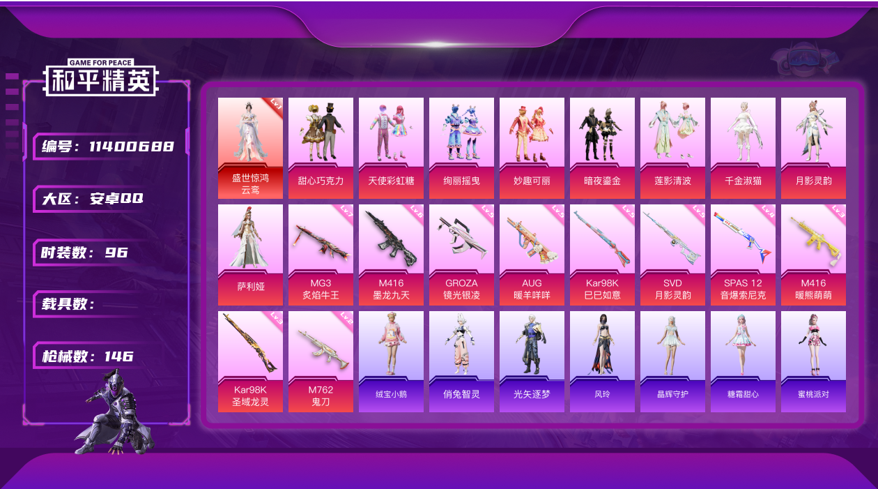 [11400688]【商品标题】:安卓 手Q-9粉装-10特效枪-0载具-59968热力值-8印记-96套装-146枪皮 【角色神装】:盛世惊鸿-云鸾 【角色神装等级】:盛世惊鸿-云鸾(一级) 【特效枪等级】:M416-暖熊萌萌(三级),M416-墨龙九天(六级),GROZA-镜光银凌(五级),AUG-暖羊咩咩(五级),M762-鬼刀(二级),Kar98K-巳巳如意(五级),Kar98K-圣域龙灵(三级),SVD-月影灵韵(五级),SPAS-12-音爆索尼克(四级),MG3-炙焰牛王(七级) 【优质套装】:粉装-甜心巧克力,粉装-天使彩虹糖,粉装-绚丽摇曳,粉装-妙趣可丽,粉装-暗夜鎏金,粉装-莲影清波,角色-千金淑猫,角色-月影灵韵,角色-萨利娅 【稀有套装】:套装-龟仙人,套装-绒宝小鹅,套装-巳巳如意,角色-许七安,角色-俏兔智灵,角色-光矢逐梦,套装-燕燕于飞,套装-鱼渊荷华,角色-风玲,套装-晶辉守护,角色-糖霜甜心,角色-蜜桃派对,套装-蓝冰羽 【优质武器皮肤】:M416-暖熊萌萌,M416-墨龙九天,GROZA-镜光银凌,AUG-暖羊咩咩,M762-鬼刀,Kar98K-巳巳如意,Kar98K-圣域龙灵,SVD-月影灵韵,SPAS-12-音爆索尼克,MG3-炙焰牛王 【稀有武器皮肤】:AKM-彩虹符号,AKM-灼热熔岩,AKM-破晓战魂,M16A4-幻世战舞者,M16A4-甜心亚梦,M16A4-千金淑猫,SCAR-L-炫彩节奏,SCAR-L-玉兔迎春,SCAR-L-红色方程式,M416-糯团青竹,M416-紫翼圣骑,M416-红色方程式,M416-蓝色火焰,GROZA-懵萌河马,GROZA-田园牧歌,AUG-天降萌叽,AUG-甜蜜菠萝,AUG-耀粉歌者,AUG-月影灵韵,QBZ-妙趣可丽,QBZ-彩虹符号,QBZ-飞驰魅影,M762-天降萌叽,M762-暗夜鎏金,M762-橘柚倾心,M762-甜心宝贝,Mk47-妙红点点,G36C-懵萌河马,AC-VAL-天降萌叽,AC-VAL-快闪甜心,AC-VAL-甜心亚梦,蜜獾-垂柳戏鸭,蜜獾-天降萌叽,蜜獾-娇憨猪猪,Famas-墨龙九天,UZI-娇憨猪猪,UZI-月影灵韵,UMP45-仲夏莫吉托,UMP45-涂山之恋,UMP45-生命誓言,UMP45-绒宝小鹅,Vector-生命誓言,Vector-田园牧歌,汤姆逊-耀粉歌者,A