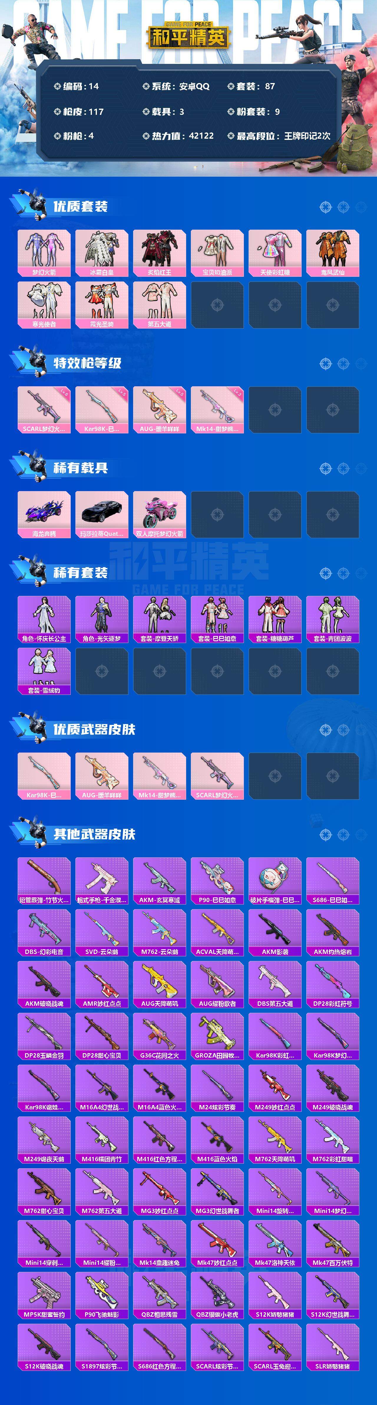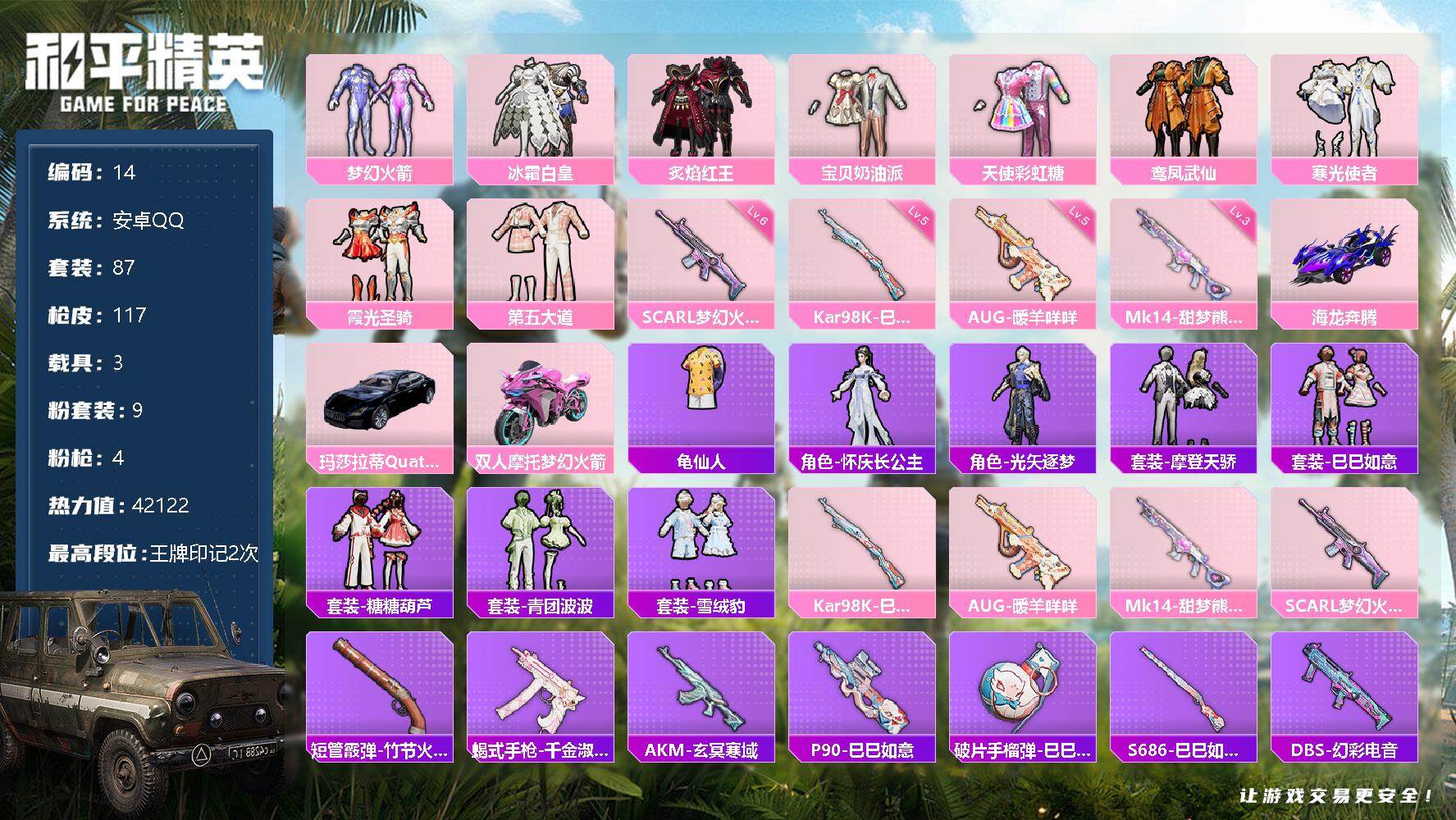[11401943]【商品标题】:安卓 手Q-9粉装-4特效枪-3载具-42122热力值-2印记-87套装-117枪皮 【稀有载具】:玛莎拉蒂Quattroporte(夜幕蓝),海龙奔腾,双人摩托-梦幻火箭 【特效枪等级】:SCAR-L-梦幻火箭(六级),AUG-暖羊咩咩(五级),Kar98K-巳巳如意(五级),Mk14-甜梦熊击(三级) 【优质套装】:粉装-宝贝奶油派,粉装-天使彩虹糖,粉装-梦幻火箭,粉装-冰霜白皇,粉装-炙焰红王,粉装-鸾凤武仙,粉装-霞光圣骑,粉装-寒光使者,粉装-第五大道 【稀有套装】:套装-龟仙人,套装-摩登天骄,套装-巳巳如意,套装-糖糖葫芦,套装-青团波波,角色-怀庆长公主,角色-光矢逐梦,套装-雪绒豹 【优质武器皮肤】:SCAR-L-梦幻火箭,AUG-暖羊咩咩,Kar98K-巳巳如意,Mk14-甜梦熊击 【稀有武器皮肤】:AKM-影袭,AKM-灼热熔岩,AKM-破晓战魂,AKM-玄冥寒域,M16A4-幻世战舞者,M16A4-蓝色火焰,SCAR-L-炫彩节奏,SCAR-L-玉兔迎春,M416-糯团青竹,M416-红色方程式,M416-蓝色火焰,GROZA-田园牧歌,AUG-天降萌叽,AUG-耀粉歌者,QBZ-相思残雪,QBZ-银碳小老虎,M762-天降萌叽,M762-彩虹甜喵,M762-甜心宝贝,M762-第五大道,M762-云朵鹅,Mk47-妙红点点,Mk47-洛神天依,Mk47-百万伏特,G36C-花间之火,AC-VAL-天降萌叽,蜜獾-垂柳戏鸭,蜜獾-娇憨猪猪,UZI-啾咪啾咪,UZI-天降萌叽,UZI-娇憨猪猪,UMP45-夜灯,UMP45-蓝色火焰,Vector-生命誓言,Vector-田园牧歌,汤姆逊-耀粉歌者,MP5K-甜蜜誓约,P90-飞驰魅影,P90-巳巳如意,Kar98K-彩虹符号,Kar98K-梦幻火箭,Kar98K-诡娃娃,M24-炫彩节奏,VSS-田园牧歌,Mini14-旋转彩虹,Mini14-梦幻火箭,Mini14-穿刺龙虾,Mini14-耀粉歌者,Mk14-童趣迷兔,SLR-娇憨猪猪,AMR-妙红点点,SVD-云朵鹅,S686-红色方程式,S686-巳巳如意,S1897-炫彩节奏,S12K-破晓战魂,S12K-娇憨猪猪,S12K-幻世战舞者,DBS-第五大道,DBS-幻彩电音,SPAS-12-田园牧歌,M249-妙红点点,