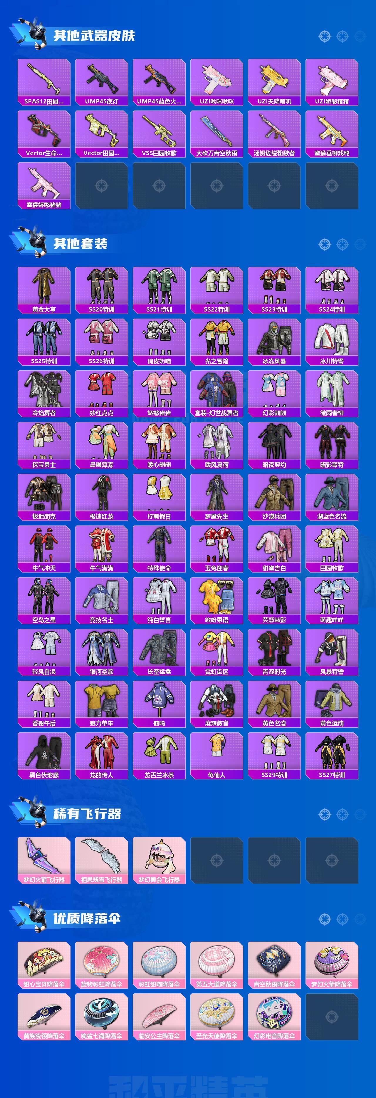 【稀有武器皮肤】:AKM-影袭,AKM-灼热熔岩,AKM-破晓战魂,AKM-玄冥寒域,M16A4-幻世战舞者,M16A4-蓝色火焰,SCAR-L-炫彩节奏,SCAR-L-玉兔迎春,M416-糯团青竹,M416-红色方程式,M416-蓝色火焰,GROZA-田园牧歌,AUG-天降萌叽,AUG-耀粉歌者,QBZ-相思残雪,QBZ-银碳小老虎,M762-天降萌叽,M762-彩虹甜喵,M762-甜心宝贝,M762-第五大道,M762-云朵鹅,Mk47-妙红点点,Mk47-洛神天依,Mk47-百万伏特,G36C-花间之火,AC-VAL-天降萌叽,蜜獾-垂柳戏鸭,蜜獾-娇憨猪猪,UZI-啾咪啾咪,UZI-天降萌叽,UZI-娇憨猪猪,UMP45-夜灯,UMP45-蓝色火焰,Vector-生命誓言,Vector-田园牧歌,汤姆逊-耀粉歌者,MP5K-甜蜜誓约,P90-飞驰魅影,P90-巳巳如意,Kar98K-彩虹符号,Kar98K-梦幻火箭,Kar98K-诡娃娃,M24-炫彩节奏,VSS-田园牧歌,Mini14-旋转彩虹,Mini14-梦幻火箭,Mini14-穿刺龙虾,Mini14-耀粉歌者,Mk14-童趣迷兔,SLR-娇憨猪猪,AMR-妙红点点,SVD-云朵鹅,S686-红色方程式,S686-巳巳如意,S1897-炫彩节奏,S12K-破晓战魂,S12K-娇憨猪猪,S12K-幻世战舞者,DBS-第五大道,DBS-幻彩电音,SPAS-12-田园牧歌,M249-妙红点点,