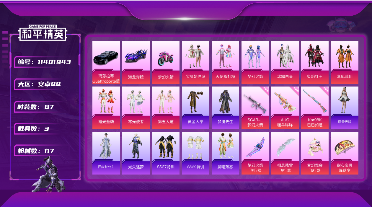 - PX_2090296- 安卓手Q-20王牌印记-有战神框-14粉装-11特效枪-5载具-118602热力值-242套装-327枪皮-0卓越印记-0传奇印记 【14粉装】,梦幻火箭,零号机款机体服,雪月幻音,傲傲奶龙,双星鱼跃,冰域雷影,古堡领主,蔷薇星,圣堂之誓,紫电风暴,银河战甲,天禅智恒,幻影战神,数码大师 【11特效枪】AKM-炫紫旋律-7级 SCAR-L-梦幻火箭-7级 M416-超新星-