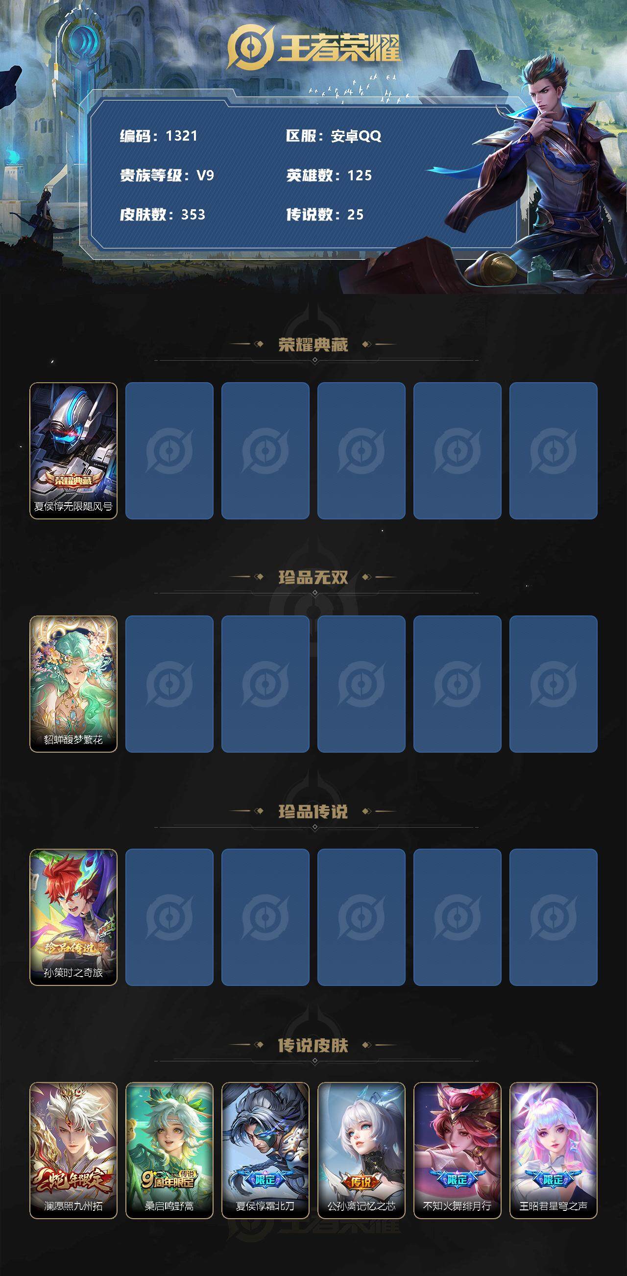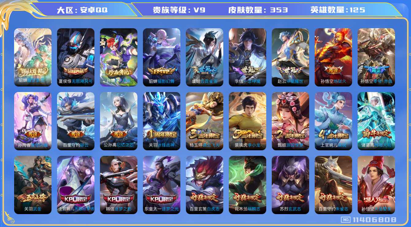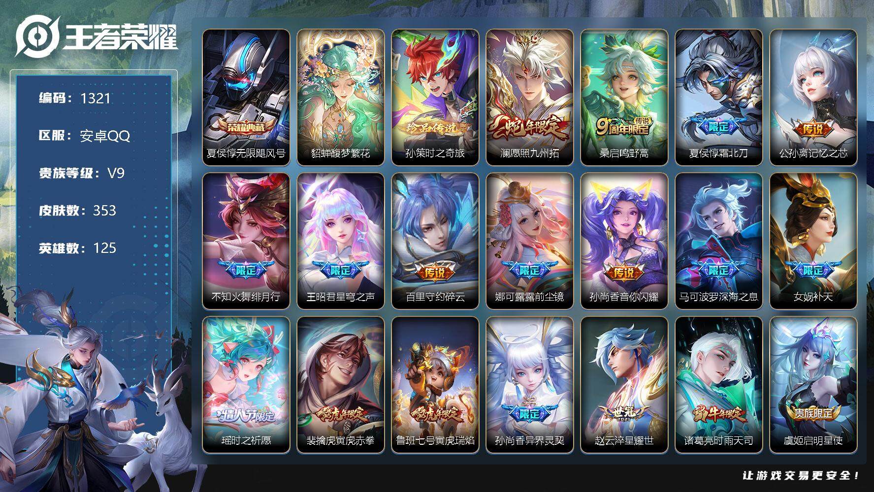 [11406808]【商品标题】:安卓Q-V9-最强王者段位-125英雄-353皮肤-1典藏-1珍品无双-0无双-1珍品传说-25传说-119史诗