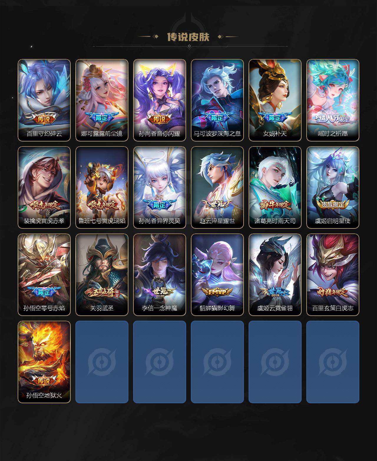 【传说皮肤】:澜愿照九州拓,桑启鸣野蒿,夏侯惇霜北刀,公孙离记忆之芯,不知火舞绯月行,王昭君星穹之声,百里守约碎云,娜可露露前尘镜,孙尚香音你闪耀,马可波罗深海之息,女娲补天,瑶时之祈愿,裴擒虎寅虎赤拳,鲁班七号寅虎瑞焰,孙尚香异界灵契,赵云淬星耀世,诸葛亮时雨天司,虞姬启明星使,孙悟空零号赤焰,关羽武圣,李信一念神魔,貂蝉猫影幻舞,虞姬云霓雀翎,百里玄策白虎志,孙悟空地狱火