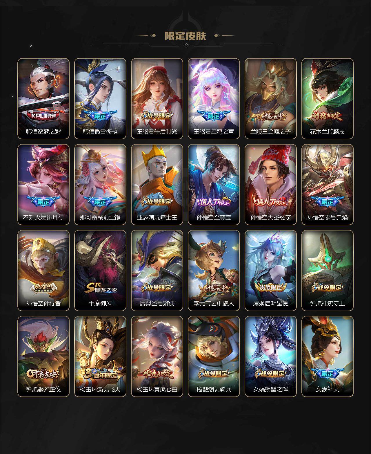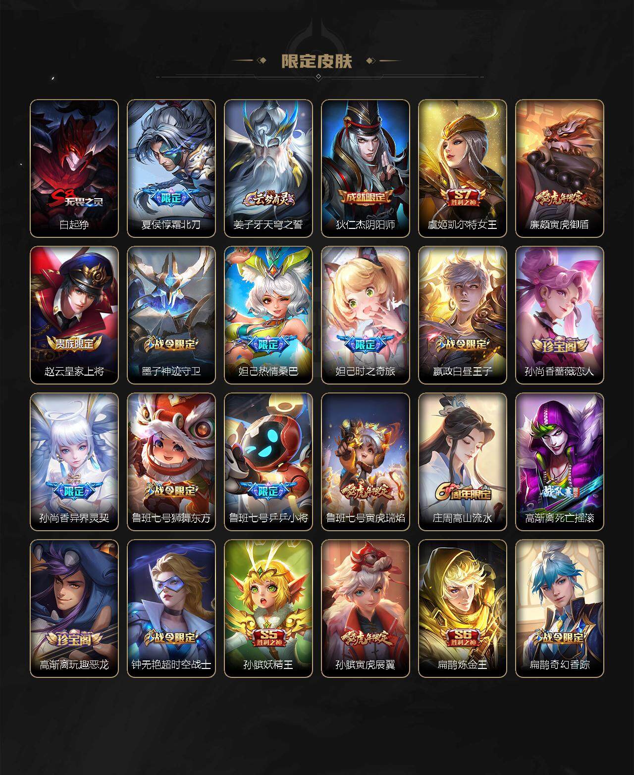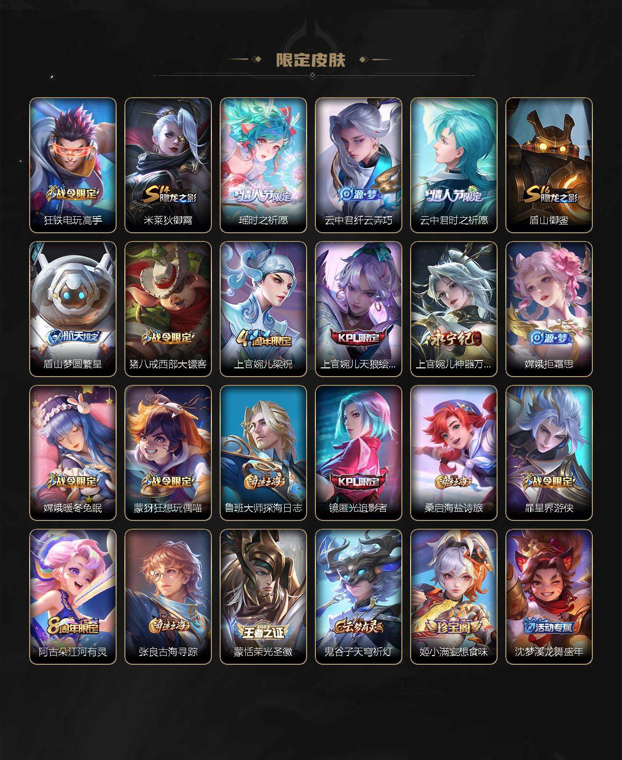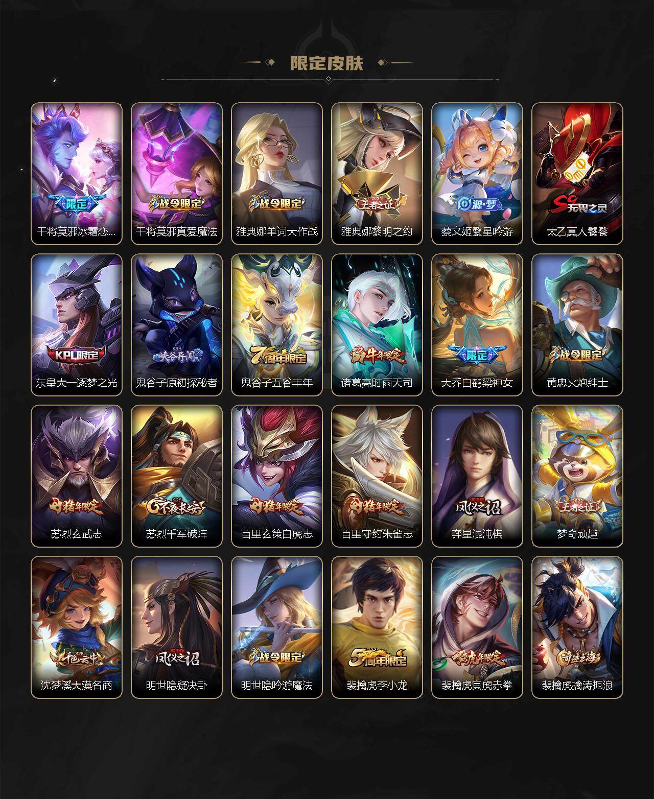 【限定皮肤】:白起狰,夏侯惇霜北刀,姜子牙天穹之誓,狄仁杰阴阳师,虞姬凯尔特女王,廉颇寅虎御盾,赵云皇家上将,墨子神迹守卫,妲己热情桑巴,妲己时之奇旅,嬴政白昼王子,孙尚香蔷薇恋人,孙尚香异界灵契,鲁班七号狮舞东方,鲁班七号乒乒小将,鲁班七号寅虎瑞焰,庄周高山流水,高渐离死亡摇滚,高渐离玩趣恶龙,钟无艳超时空战士,孙膑妖精王,孙膑寅虎展翼,扁鹊炼金王,扁鹊奇幻香踪,白起夜都怪侠,芈月重明,芈月幻夜卜梦,元歌云间偶戏,元歌无心,夏侯惇朔风刀,夏侯惇匿光决锋者,甄姬女儿国国王,甄姬游园惊梦,甄姬落雪兰心,曹操烛龙,典韦蓝屏警告,马可波罗暗影游猎,马可波罗深海之息,狄仁杰魔术师,狄仁杰万华元夜,达摩沙漠行僧,项羽海滩派对,老夫子醍醐杖,老夫子航海奇遇记,关羽冰锋战神,关羽武圣,程咬金演武夺筹,露娜一生所爱,韩信逐梦之影,韩信傲雪梅枪,王昭君午后时光,王昭君星穹之声,兰陵王金庭之子,花木兰瑞麟志,不知火舞绯月行,娜可露露前尘镜,亚瑟潮玩骑士王,孙悟空至尊宝,孙悟空大圣娶亲,孙悟空零号赤焰,孙悟空孙行者,牛魔御旌,后羿圣弓游侠,李元芳云中旅人,虞姬启明星使,钟馗神迹守卫,钟馗驱傩正仪,杨玉环遇见飞天,杨玉环寅虎心曲,杨戬潮玩骑兵,女娲朔望之晖,女娲补天,干将莫邪冰霜恋舞曲,干将莫邪真爱魔法,雅典娜单词大作战,雅典娜黎明之约,蔡文姬繁星吟游,太乙真人饕餮,东皇太一逐梦之光,鬼谷子原初探秘者,鬼谷子五谷丰年,诸葛亮时雨天司,大乔白鹤梁神女,黄忠火炮绅士,苏烈玄武志,苏烈千军破阵,百里玄策白虎志,百里守约朱雀志,弈星混沌棋,梦奇顽趣,沈梦溪大漠名商,明世隐疑决卦,明世隐吟游魔法,裴擒虎李小龙,裴