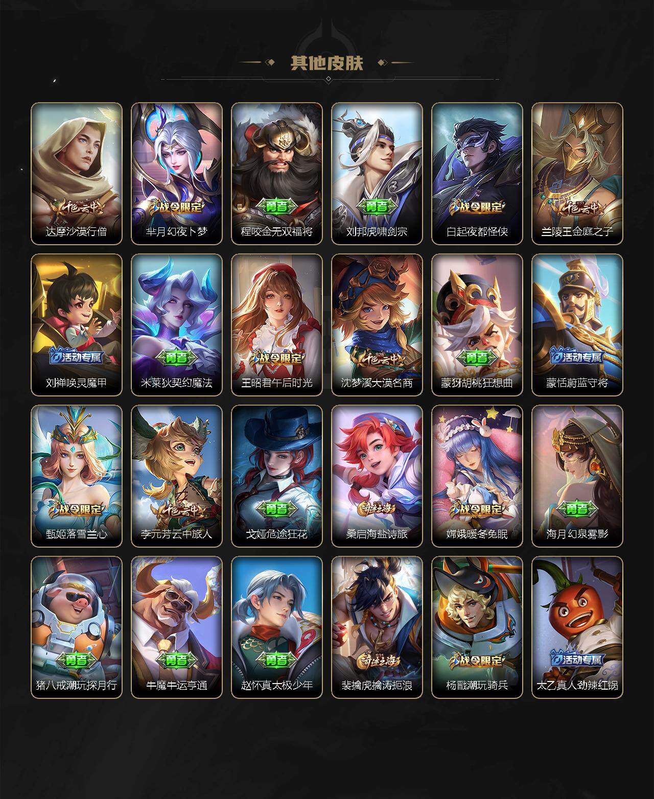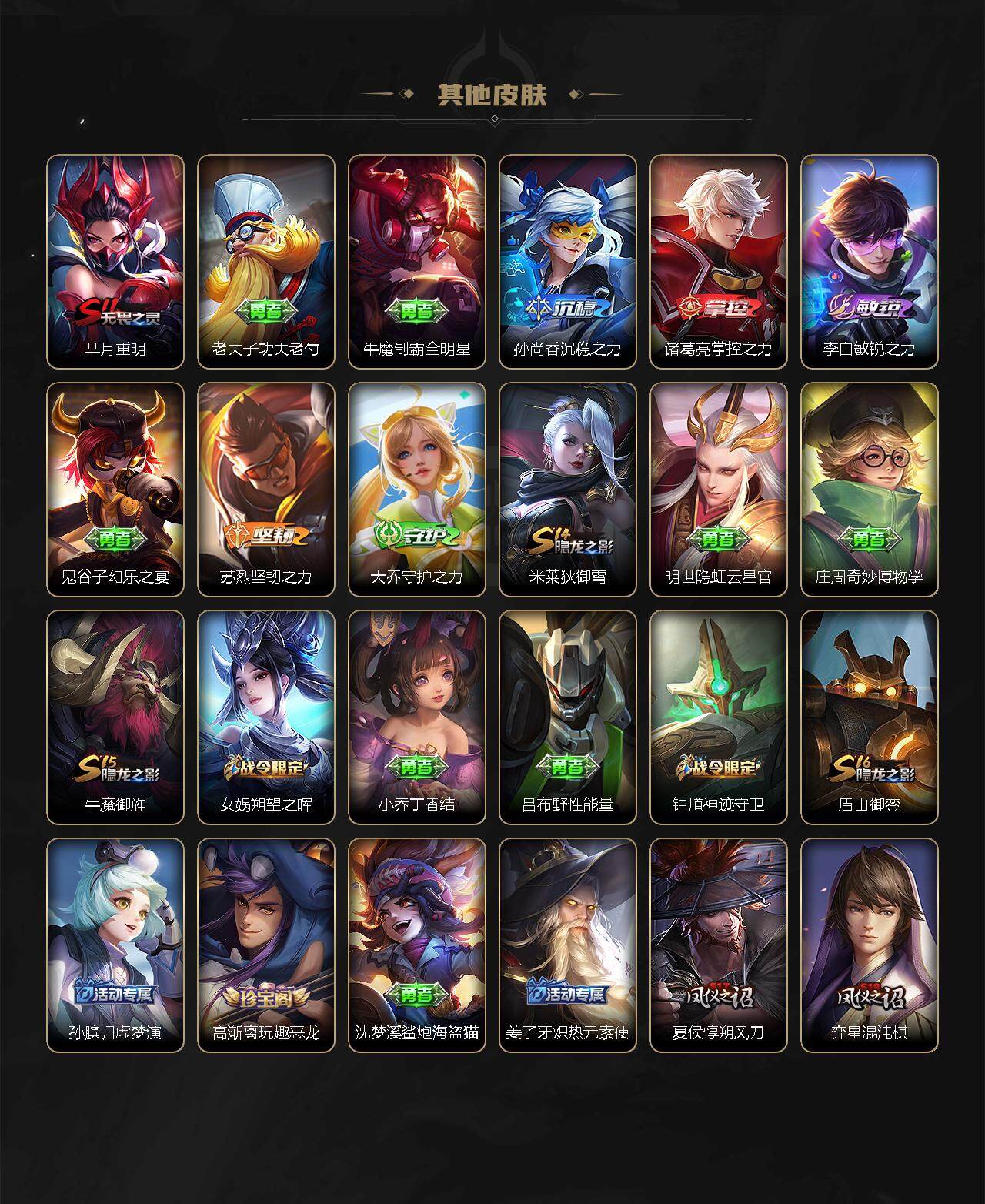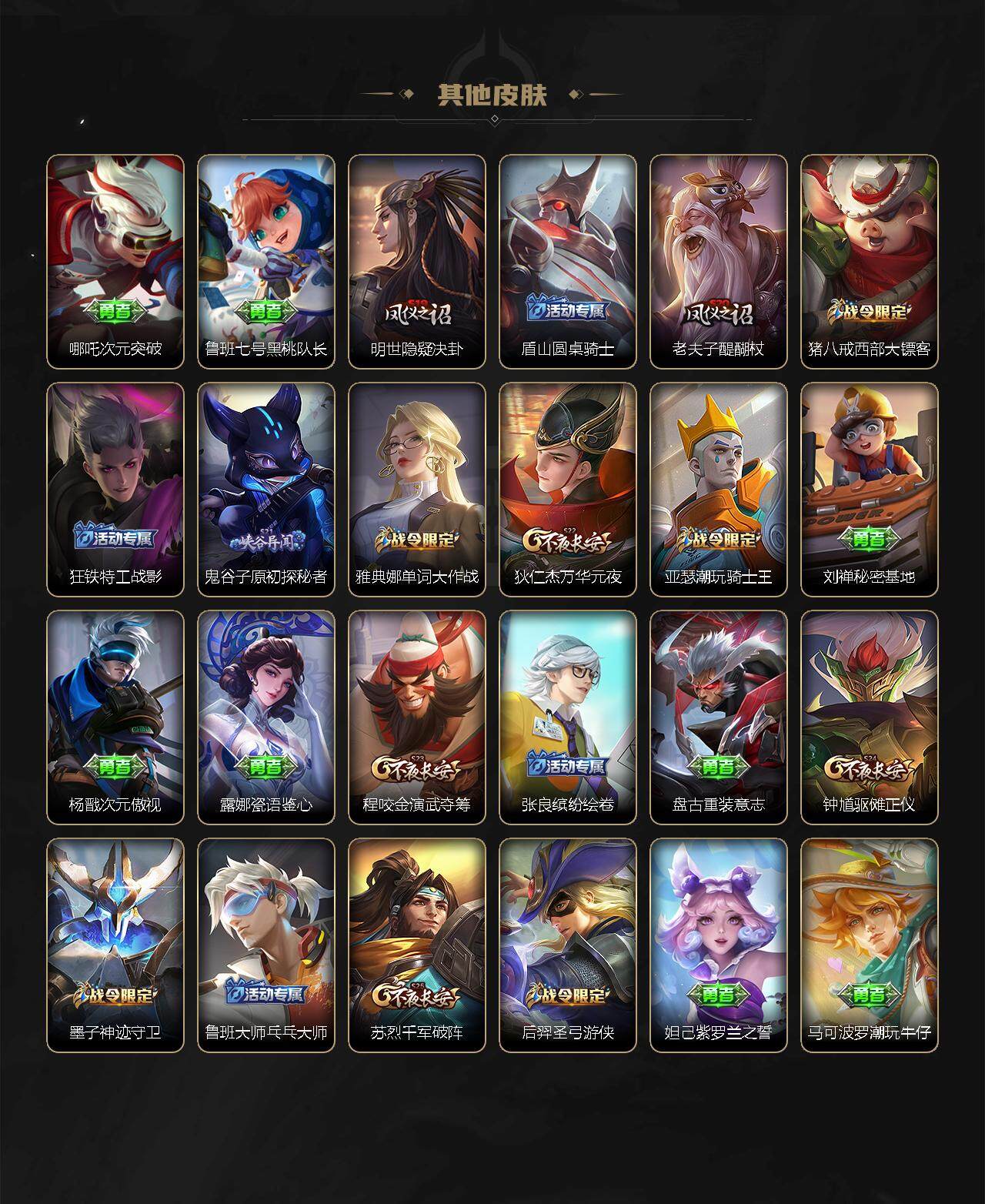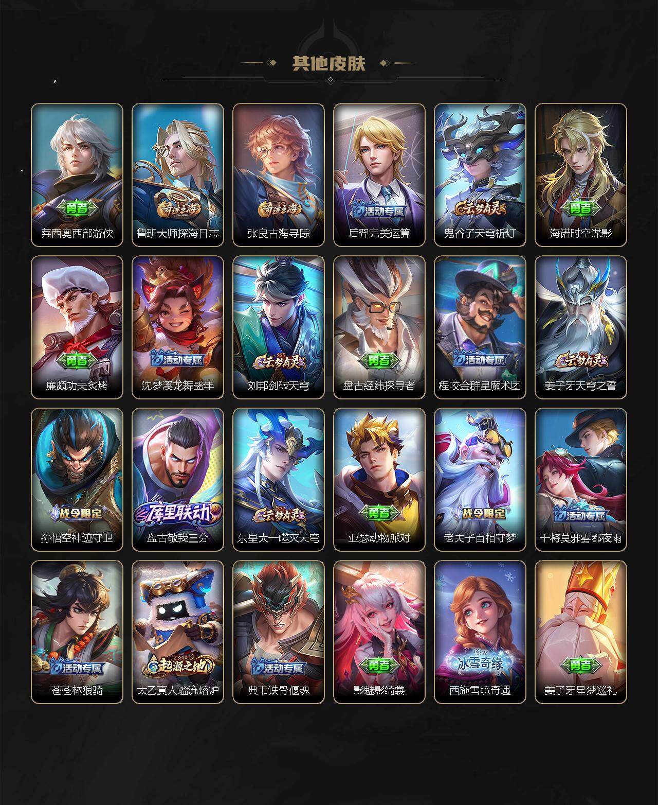 【限定皮肤】:白起狰,夏侯惇霜北刀,姜子牙天穹之誓,狄仁杰阴阳师,虞姬凯尔特女王,廉颇寅虎御盾,赵云皇家上将,墨子神迹守卫,妲己热情桑巴,妲己时之奇旅,嬴政白昼王子,孙尚香蔷薇恋人,孙尚香异界灵契,鲁班七号狮舞东方,鲁班七号乒乒小将,鲁班七号寅虎瑞焰,庄周高山流水,高渐离死亡摇滚,高渐离玩趣恶龙,钟无艳超时空战士,孙膑妖精王,孙膑寅虎展翼,扁鹊炼金王,扁鹊奇幻香踪,白起夜都怪侠,芈月重明,芈月幻夜卜梦,元歌云间偶戏,元歌无心,夏侯惇朔风刀,夏侯惇匿光决锋者,甄姬女儿国国王,甄姬游园惊梦,甄姬落雪兰心,曹操烛龙,典韦蓝屏警告,马可波罗暗影游猎,马可波罗深海之息,狄仁杰魔术师,狄仁杰万华元夜,达摩沙漠行僧,项羽海滩派对,老夫子醍醐杖,老夫子航海奇遇记,关羽冰锋战神,关羽武圣,程咬金演武夺筹,露娜一生所爱,韩信逐梦之影,韩信傲雪梅枪,王昭君午后时光,王昭君星穹之声,兰陵王金庭之子,花木兰瑞麟志,不知火舞绯月行,娜可露露前尘镜,亚瑟潮玩骑士王,孙悟空至尊宝,孙悟空大圣娶亲,孙悟空零号赤焰,孙悟空孙行者,牛魔御旌,后羿圣弓游侠,李元芳云中旅人,虞姬启明星使,钟馗神迹守卫,钟馗驱傩正仪,杨玉环遇见飞天,杨玉环寅虎心曲,杨戬潮玩骑兵,女娲朔望之晖,女娲补天,干将莫邪冰霜恋舞曲,干将莫邪真爱魔法,雅典娜单词大作战,雅典娜黎明之约,蔡文姬繁星吟游,太乙真人饕餮,东皇太一逐梦之光,鬼谷子原初探秘者,鬼谷子五谷丰年,诸葛亮时雨天司,大乔白鹤梁神女,黄忠火炮绅士,苏烈玄武志,苏烈千军破阵,百里玄策白虎志,百里守约朱雀志,弈星混沌棋,梦奇顽趣,沈梦溪大漠名商,明世隐疑决卦,明世隐吟游魔法,裴擒虎李小龙,裴