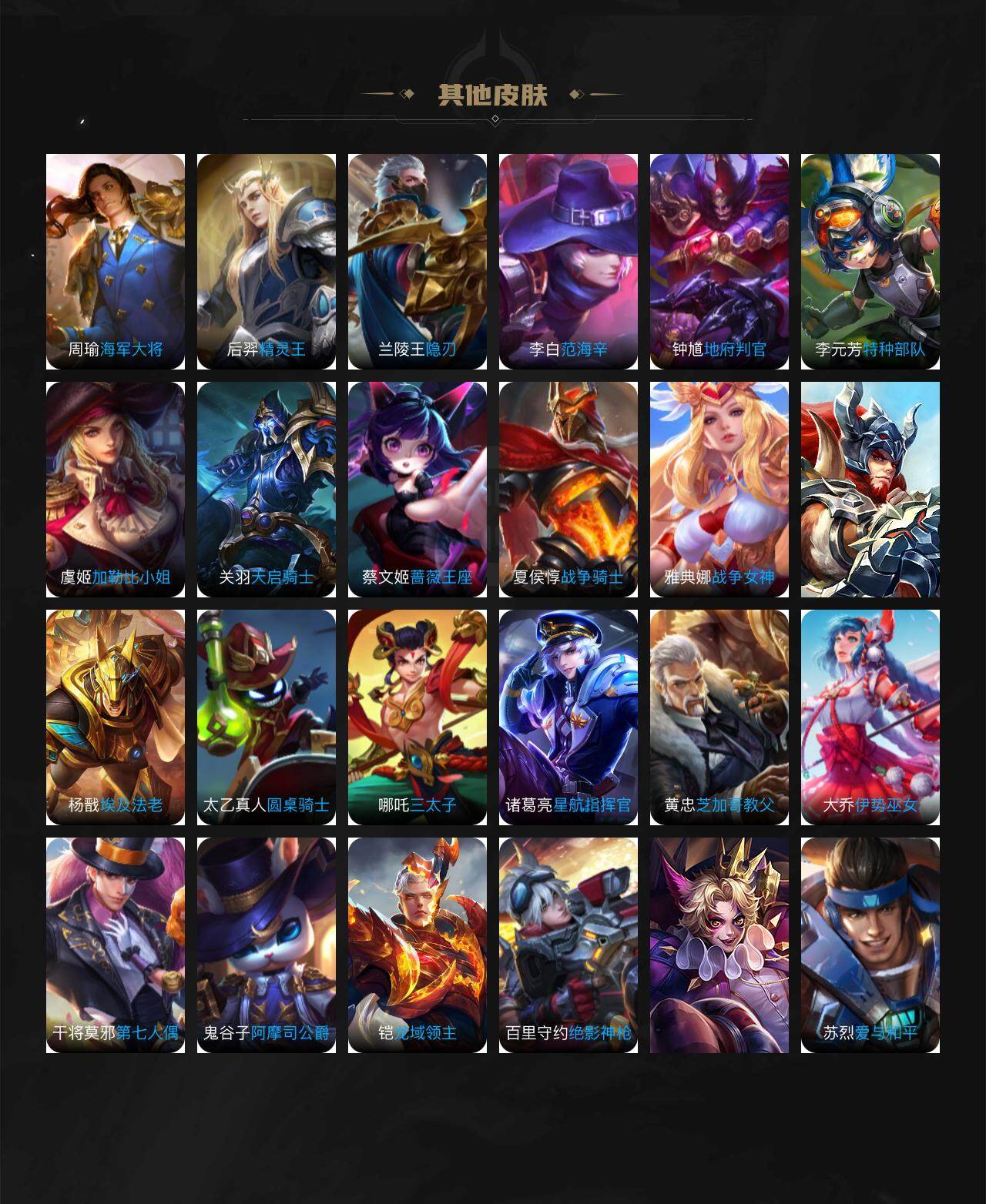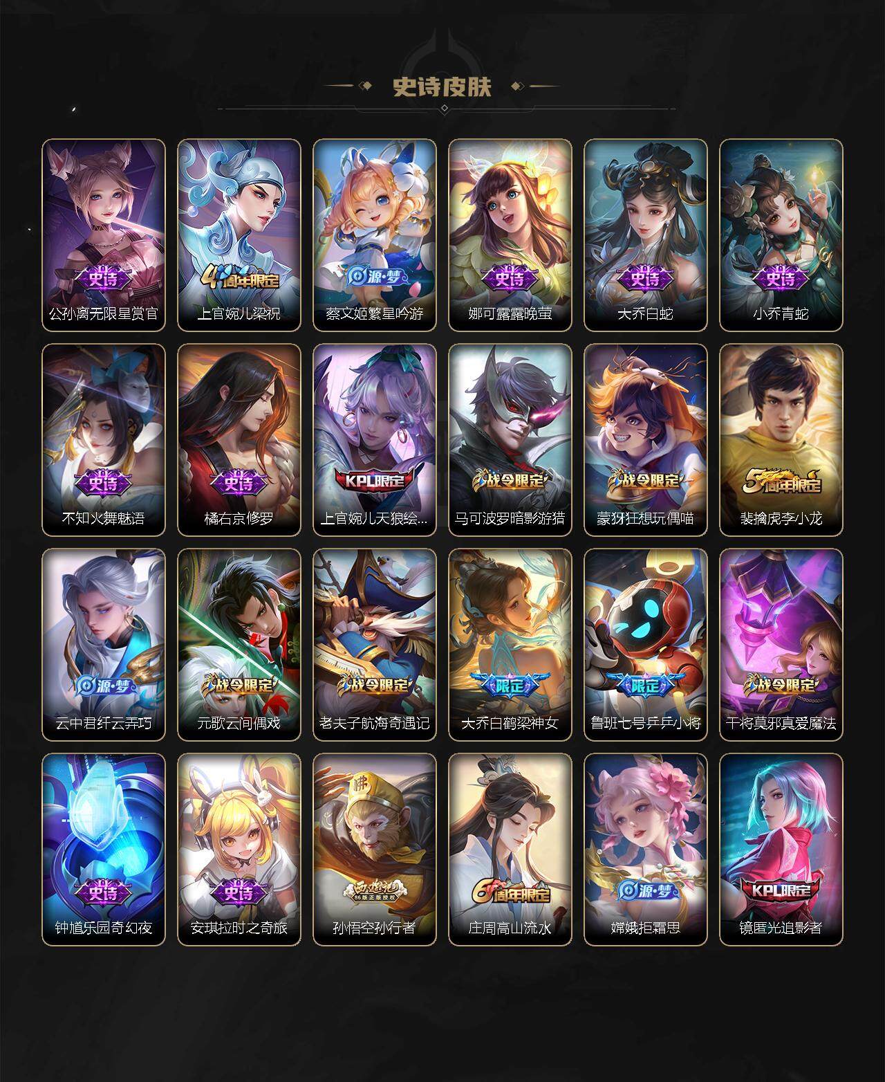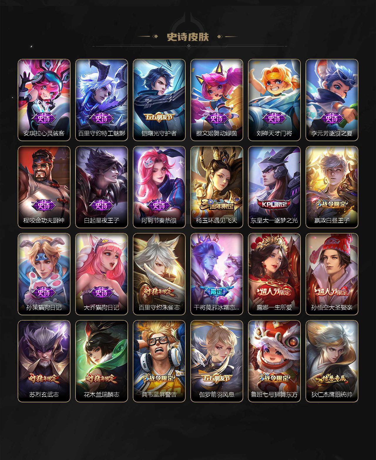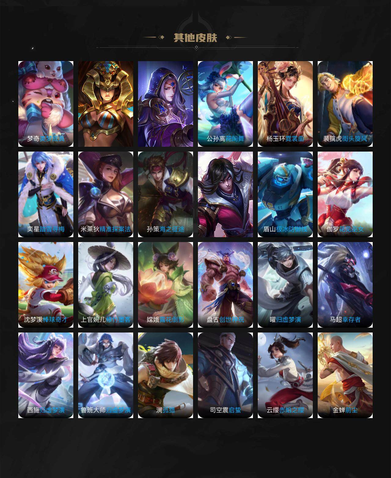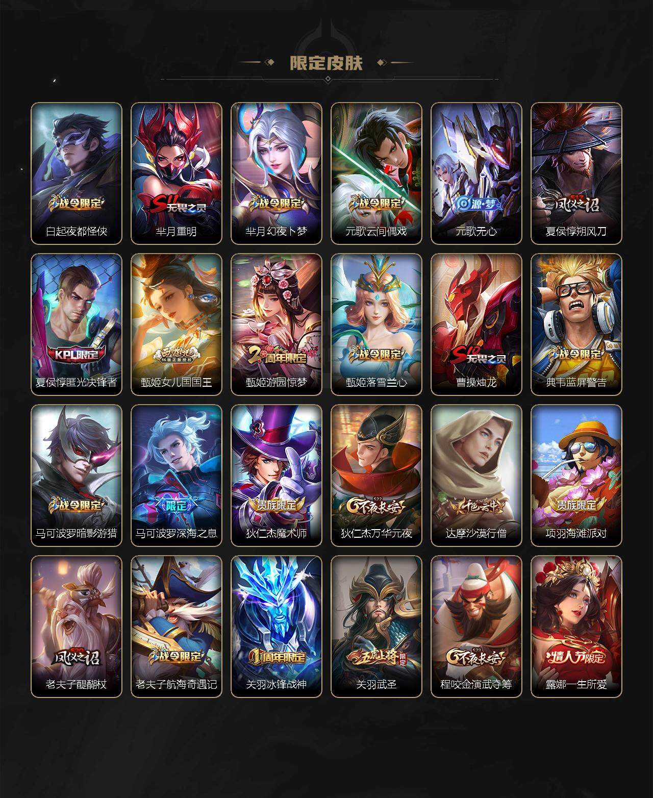 【限定皮肤】:白起狰,夏侯惇霜北刀,姜子牙天穹之誓,狄仁杰阴阳师,虞姬凯尔特女王,廉颇寅虎御盾,赵云皇家上将,墨子神迹守卫,妲己热情桑巴,妲己时之奇旅,嬴政白昼王子,孙尚香蔷薇恋人,孙尚香异界灵契,鲁班七号狮舞东方,鲁班七号乒乒小将,鲁班七号寅虎瑞焰,庄周高山流水,高渐离死亡摇滚,高渐离玩趣恶龙,钟无艳超时空战士,孙膑妖精王,孙膑寅虎展翼,扁鹊炼金王,扁鹊奇幻香踪,白起夜都怪侠,芈月重明,芈月幻夜卜梦,元歌云间偶戏,元歌无心,夏侯惇朔风刀,夏侯惇匿光决锋者,甄姬女儿国国王,甄姬游园惊梦,甄姬落雪兰心,曹操烛龙,典韦蓝屏警告,马可波罗暗影游猎,马可波罗深海之息,狄仁杰魔术师,狄仁杰万华元夜,达摩沙漠行僧,项羽海滩派对,老夫子醍醐杖,老夫子航海奇遇记,关羽冰锋战神,关羽武圣,程咬金演武夺筹,露娜一生所爱,韩信逐梦之影,韩信傲雪梅枪,王昭君午后时光,王昭君星穹之声,兰陵王金庭之子,花木兰瑞麟志,不知火舞绯月行,娜可露露前尘镜,亚瑟潮玩骑士王,孙悟空至尊宝,孙悟空大圣娶亲,孙悟空零号赤焰,孙悟空孙行者,牛魔御旌,后羿圣弓游侠,李元芳云中旅人,虞姬启明星使,钟馗神迹守卫,钟馗驱傩正仪,杨玉环遇见飞天,杨玉环寅虎心曲,杨戬潮玩骑兵,女娲朔望之晖,女娲补天,干将莫邪冰霜恋舞曲,干将莫邪真爱魔法,雅典娜单词大作战,雅典娜黎明之约,蔡文姬繁星吟游,太乙真人饕餮,东皇太一逐梦之光,鬼谷子原初探秘者,鬼谷子五谷丰年,诸葛亮时雨天司,大乔白鹤梁神女,黄忠火炮绅士,苏烈玄武志,苏烈千军破阵,百里玄策白虎志,百里守约朱雀志,弈星混沌棋,梦奇顽趣,沈梦溪大漠名商,明世隐疑决卦,明世隐吟游魔法,裴擒虎李小龙,裴