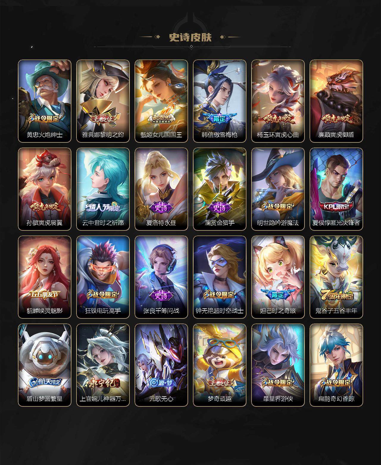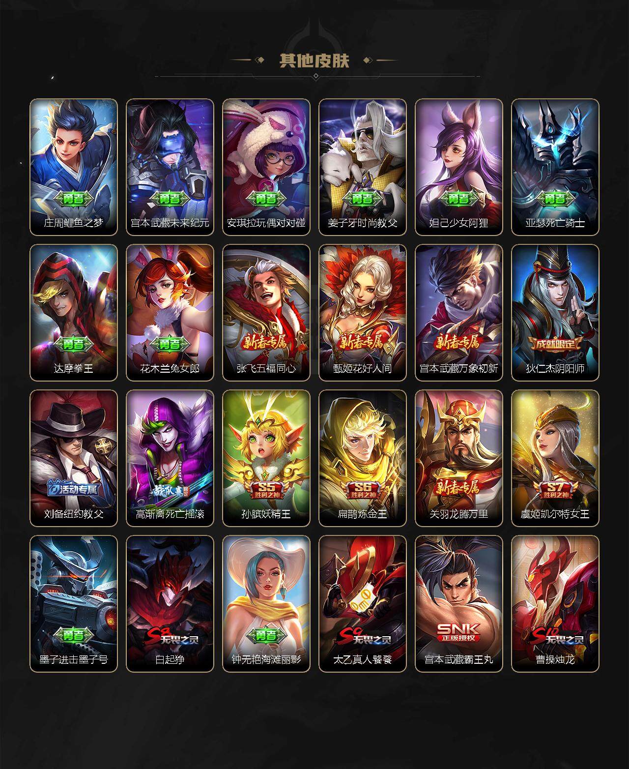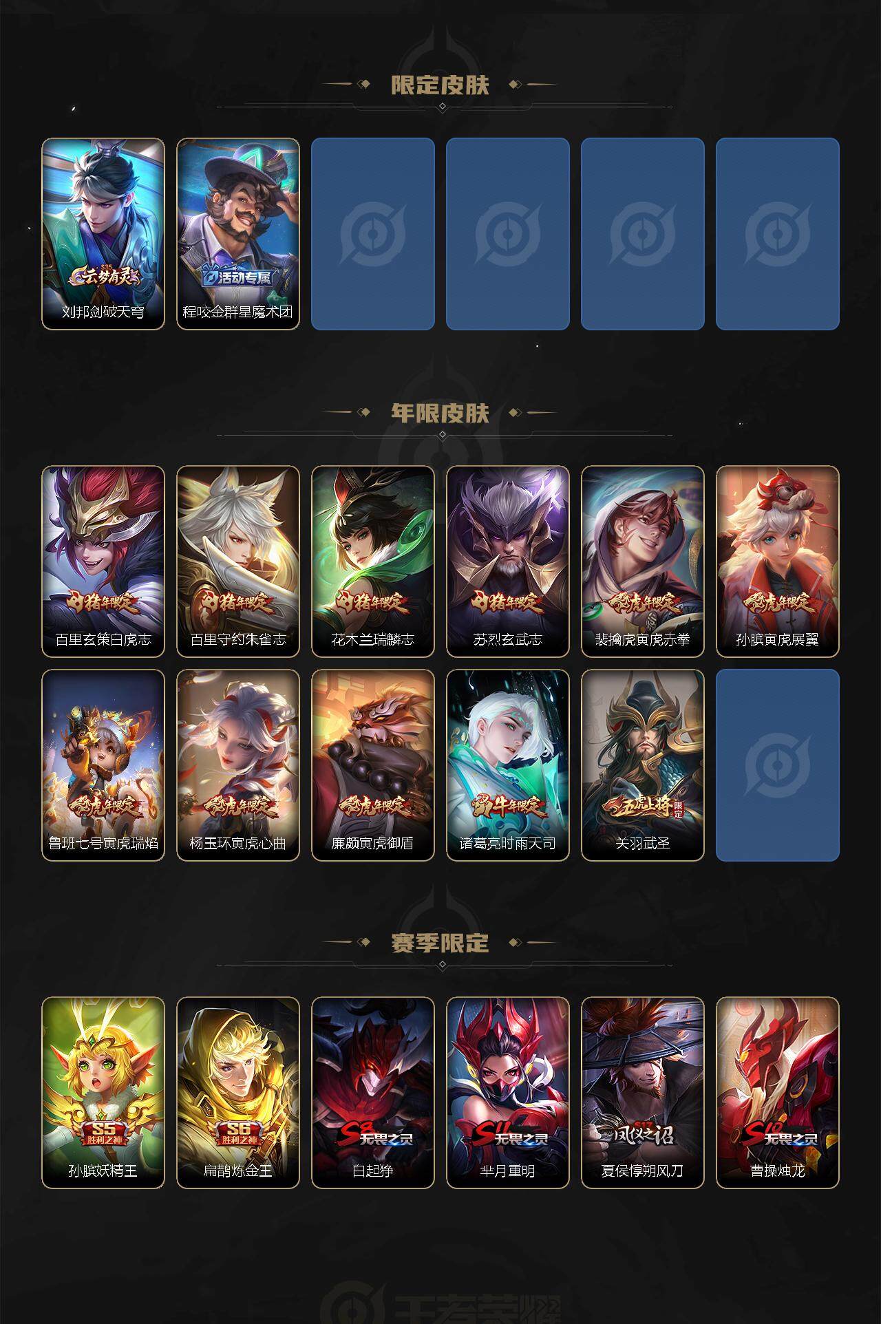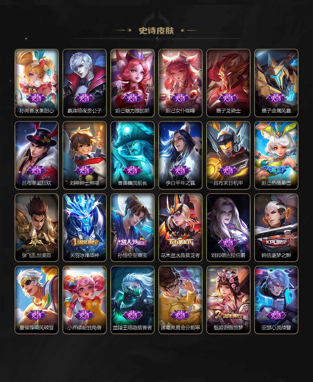 【限定皮肤】:白起狰,夏侯惇霜北刀,姜子牙天穹之誓,狄仁杰阴阳师,虞姬凯尔特女王,廉颇寅虎御盾,赵云皇家上将,墨子神迹守卫,妲己热情桑巴,妲己时之奇旅,嬴政白昼王子,孙尚香蔷薇恋人,孙尚香异界灵契,鲁班七号狮舞东方,鲁班七号乒乒小将,鲁班七号寅虎瑞焰,庄周高山流水,高渐离死亡摇滚,高渐离玩趣恶龙,钟无艳超时空战士,孙膑妖精王,孙膑寅虎展翼,扁鹊炼金王,扁鹊奇幻香踪,白起夜都怪侠,芈月重明,芈月幻夜卜梦,元歌云间偶戏,元歌无心,夏侯惇朔风刀,夏侯惇匿光决锋者,甄姬女儿国国王,甄姬游园惊梦,甄姬落雪兰心,曹操烛龙,典韦蓝屏警告,马可波罗暗影游猎,马可波罗深海之息,狄仁杰魔术师,狄仁杰万华元夜,达摩沙漠行僧,项羽海滩派对,老夫子醍醐杖,老夫子航海奇遇记,关羽冰锋战神,关羽武圣,程咬金演武夺筹,露娜一生所爱,韩信逐梦之影,韩信傲雪梅枪,王昭君午后时光,王昭君星穹之声,兰陵王金庭之子,花木兰瑞麟志,不知火舞绯月行,娜可露露前尘镜,亚瑟潮玩骑士王,孙悟空至尊宝,孙悟空大圣娶亲,孙悟空零号赤焰,孙悟空孙行者,牛魔御旌,后羿圣弓游侠,李元芳云中旅人,虞姬启明星使,钟馗神迹守卫,钟馗驱傩正仪,杨玉环遇见飞天,杨玉环寅虎心曲,杨戬潮玩骑兵,女娲朔望之晖,女娲补天,干将莫邪冰霜恋舞曲,干将莫邪真爱魔法,雅典娜单词大作战,雅典娜黎明之约,蔡文姬繁星吟游,太乙真人饕餮,东皇太一逐梦之光,鬼谷子原初探秘者,鬼谷子五谷丰年,诸葛亮时雨天司,大乔白鹤梁神女,黄忠火炮绅士,苏烈玄武志,苏烈千军破阵,百里玄策白虎志,百里守约朱雀志,弈星混沌棋,梦奇顽趣,沈梦溪大漠名商,明世隐疑决卦,明世隐吟游魔法,裴擒虎李小龙,裴