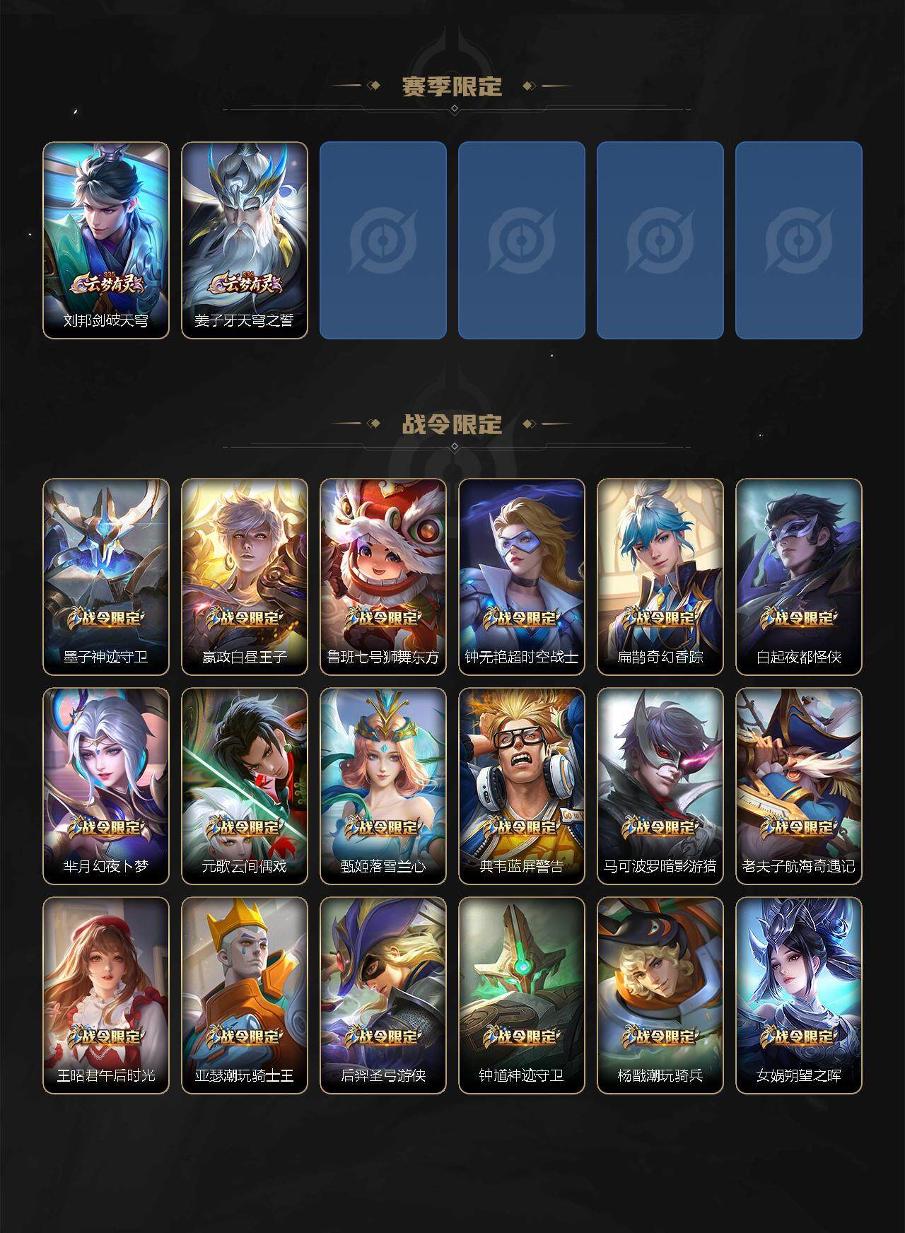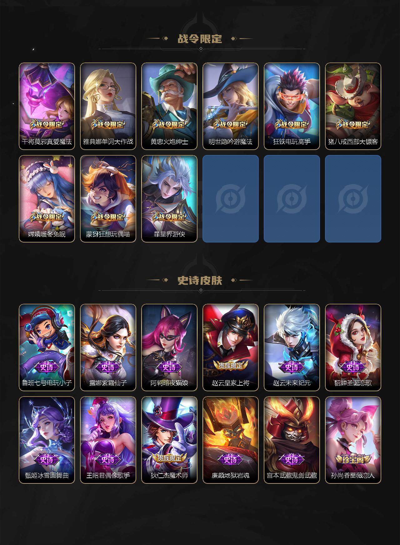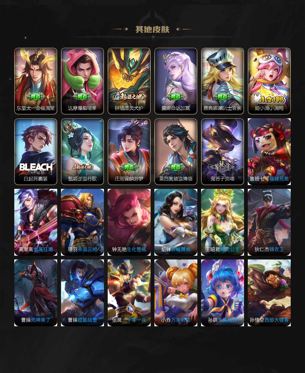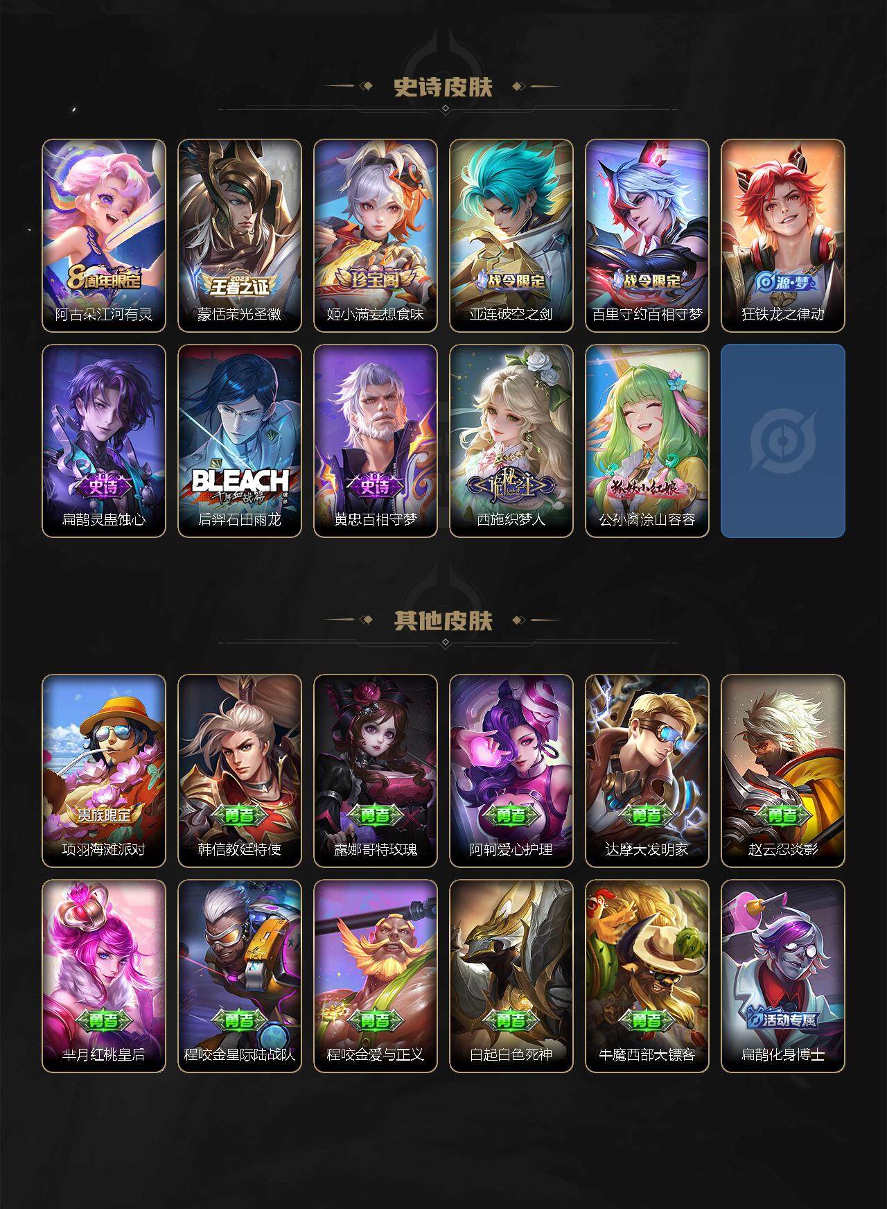 【限定皮肤】:白起狰,夏侯惇霜北刀,姜子牙天穹之誓,狄仁杰阴阳师,虞姬凯尔特女王,廉颇寅虎御盾,赵云皇家上将,墨子神迹守卫,妲己热情桑巴,妲己时之奇旅,嬴政白昼王子,孙尚香蔷薇恋人,孙尚香异界灵契,鲁班七号狮舞东方,鲁班七号乒乒小将,鲁班七号寅虎瑞焰,庄周高山流水,高渐离死亡摇滚,高渐离玩趣恶龙,钟无艳超时空战士,孙膑妖精王,孙膑寅虎展翼,扁鹊炼金王,扁鹊奇幻香踪,白起夜都怪侠,芈月重明,芈月幻夜卜梦,元歌云间偶戏,元歌无心,夏侯惇朔风刀,夏侯惇匿光决锋者,甄姬女儿国国王,甄姬游园惊梦,甄姬落雪兰心,曹操烛龙,典韦蓝屏警告,马可波罗暗影游猎,马可波罗深海之息,狄仁杰魔术师,狄仁杰万华元夜,达摩沙漠行僧,项羽海滩派对,老夫子醍醐杖,老夫子航海奇遇记,关羽冰锋战神,关羽武圣,程咬金演武夺筹,露娜一生所爱,韩信逐梦之影,韩信傲雪梅枪,王昭君午后时光,王昭君星穹之声,兰陵王金庭之子,花木兰瑞麟志,不知火舞绯月行,娜可露露前尘镜,亚瑟潮玩骑士王,孙悟空至尊宝,孙悟空大圣娶亲,孙悟空零号赤焰,孙悟空孙行者,牛魔御旌,后羿圣弓游侠,李元芳云中旅人,虞姬启明星使,钟馗神迹守卫,钟馗驱傩正仪,杨玉环遇见飞天,杨玉环寅虎心曲,杨戬潮玩骑兵,女娲朔望之晖,女娲补天,干将莫邪冰霜恋舞曲,干将莫邪真爱魔法,雅典娜单词大作战,雅典娜黎明之约,蔡文姬繁星吟游,太乙真人饕餮,东皇太一逐梦之光,鬼谷子原初探秘者,鬼谷子五谷丰年,诸葛亮时雨天司,大乔白鹤梁神女,黄忠火炮绅士,苏烈玄武志,苏烈千军破阵,百里玄策白虎志,百里守约朱雀志,弈星混沌棋,梦奇顽趣,沈梦溪大漠名商,明世隐疑决卦,明世隐吟游魔法,裴擒虎李小龙,裴