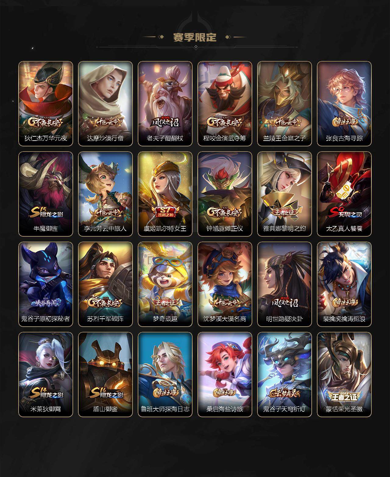 孙膑妖精王,扁鹊炼金王,虞姬凯尔特女王,白起狰,太乙真人饕餮,曹操烛龙,芈月重明,米莱狄御霄,牛魔御旌,盾山御銮,夏侯惇朔风刀,明世隐疑决卦,老夫子醍醐杖,鬼谷子原初探秘者,狄仁杰万华元夜,程咬金演武夺筹,钟馗驱傩正仪,苏烈千军破阵,嬴政白昼王子,女娲朔望之晖,典韦蓝屏警告,钟馗神迹守卫,鲁班七号狮舞东方,马可波罗暗影游猎,蒙犽狂想玩偶喵,元歌云间偶戏,弈星混沌棋,达摩沙漠行僧,兰陵王金庭之子,沈梦溪大漠名商,李元芳云中旅人,桑启海盐诗旅,裴擒虎擒涛扼浪,鲁班大师探海日志,张良古海寻踪