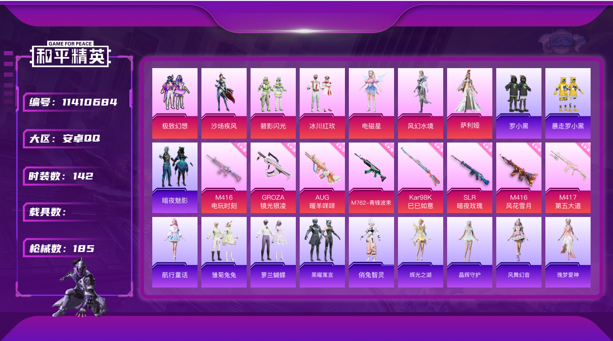 [11410684]【商品标题】:安卓 手Q-8粉装-9特效枪-0载具-58645热力值-1印记-142套装-185枪皮