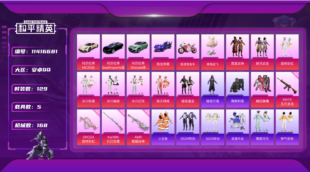 [11416681]【商品标题】:安卓 手Q-8粉装-4特效枪-5载具-60320热力值-3印记-129套装-168枪皮 【稀有载具】:玛莎拉蒂MC20(星石白),玛莎拉蒂Quattroporte(夜幕蓝),玛莎拉蒂Grecale(薄荷绿),海龙奔腾,极速兔兔车,僚机-萌兔起飞 【特效枪等级】:M416-五爪金龙(七级),GROZA-旋转彩虹(七级),Kar98K-巳巳如意(五级),AMR-智耀战神(五级) 【优质套装】:粉装-霓裳武神,粉装-朗月武圣,粉装-旋转彩虹,粉装-冰川粉黛,粉装-冰川幽秘,粉装-冰川红玫,粉装-桃夭倾城,粉装-暗夜鎏金 【稀有套装】:套装-龟仙人,套装-粉恋花,套装-紫幽梦,套装-蓝冰羽,套装-极速光影,套装-雪绒豹 【优质武器皮肤】:M416-五爪金龙,GROZA-旋转彩虹,Kar98K-巳巳如意,AMR-智耀战神 【稀有武器皮肤】:AKM-墨染幽兰,AKM-夜灯,AKM-彩虹符号,AKM-影袭,AKM-灼热熔岩,AKM-破晓战魂,AKM-霓虹街区,M16A4-幻世战舞者,M16A4-红色方程式,SCAR-L-炫彩节奏,SCAR-L-玉兔迎春,SCAR-L-红色方程式,M416-暗夜行者,M416-糯团青竹,M416-红色方程式,M416-蓝色火焰,GROZA-异彩先驱,GROZA-影袭,GROZA-懵萌河马,GROZA-田园牧歌,AUG-冰川粉黛,AUG-海螺星光,AUG-耀粉歌者,QBZ-彩虹符号,QBZ-赛罗,QBZ-飞驰魅影,M762-天降萌叽,M762-彩虹符号,M762-暗夜鎏金,M762-牛气冲天,M762-瑞龙福将,Mk47-妙红点点,G36C-懵萌河马,AC-VAL-天降萌叽,蜜獾-天降萌叽,蜜獾-娇憨猪猪,蜜獾-桃夭倾城,UZI-墨染幽兰,UZI-天降萌叽,UZI-娇憨猪猪,UZI-影袭,UZI-红色方程式,UMP45-夜灯,UMP45-涂山之恋,UMP45-生命誓言,UMP45-蓝色火焰,Vector-彩虹符号,Vector-生命誓言,Vector-田园牧歌,Vector-音爆索尼克,Vector-魅影蝠王,汤姆逊-异彩先驱,汤姆逊-炫彩节奏,汤姆逊-智耀战神,野牛-桃夭倾城,MP5K-异彩先驱,P90-快闪甜心,P90-翩跹演武,P90-飞驰魅影,Kar98K-影袭,Kar98K-梦幻火箭,Kar98K-炫彩节奏,Kar98K-红