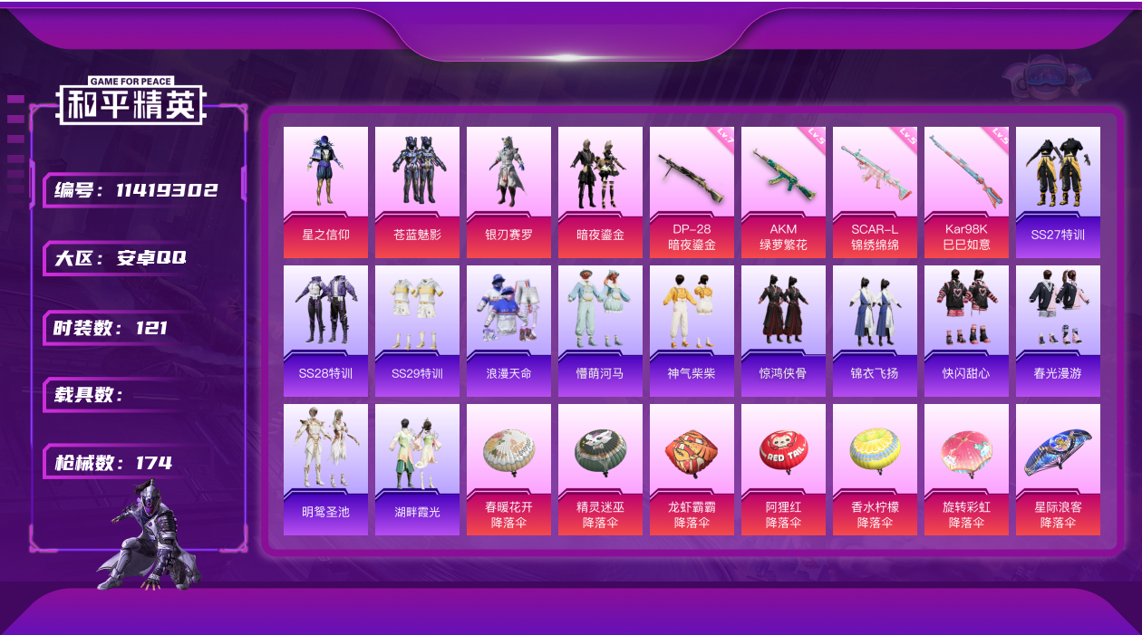 [11419302]【商品标题】:安卓 手Q-4粉装-4特效枪-0载具-48258热力值-9印记-121套装-174枪皮
