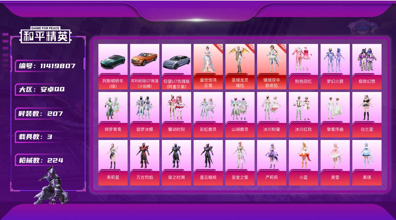 [11419807]【商品标题】:安卓 手Q-29粉装-9特效枪-3载具-89521热力值-12印记-207套装-224枪皮 【角色神装】:圣域龙灵-瑞拉,盛世惊鸿-云鸾,镜域双华-欧若拉 【角色神装等级】:圣域龙灵-瑞拉(一级),盛世惊鸿-云鸾(二级),镜域双华-欧若拉(一级) 【稀有载具】:阿斯顿马丁DBS(绿),宾利欧陆GT敞篷(火焰橘),仰望U7(阿盖尔紫) 【特效枪等级】:AKM-炫紫旋律(六级),SCAR-L-锦绣绵绵(五级),M416-风花雪月(一级),M416-至情至圣(九级),Vector-飒粉甜心(二级),Kar98K-巳巳如意(五级),Kar98K-圣域龙灵(三级),Mk14-盛世惊鸿(一级),PKM-江南烟雨(三级) 【优质套装】:粉装-粉色回忆,粉装-梦幻火箭,粉装-极致幻想,粉装-绮梦青鸾,粉装-甜梦冰蝶,粉装-馨动时刻,粉装-彩虹鹿灵,粉装-山涧鹿灵,粉装-冰川粉黛,粉装-冰川红玫,粉装-挚爱序曲,角色-白兰星,角色-茉莉星,角色-万古烈焰,角色-宙之时溯,角色-星云暗核,角色-圣堂之誓,角色-严莉莉,角色-小蓝,角色-美雪,角色-美琪,角色-星梦奇缘,角色-千金淑猫,角色-信仰神谕,粉装-幻梦之森,角色-晶梦幻蝶,角色-翎光蝶翼,角色-智耀战神 【稀有套装】:套装-龟仙人,套装-巳巳如意,套装-雏菊兔兔,套装-萝兰蝴蝶,套装-小熊娃娃,套装-糖糖葫芦,套装-青团波波,套装-棉花软糖,角色-都市丽猫,角色-摩登魅猫,套装-裁决天象,套装-燕燕于飞,套装-鱼渊荷华,套装-辉光之湖,套装-迷雾之月,角色-风玲,角色-海琴烟,套装-晶灵使者,套装-晶辉守护,角色-琉璃花蕾,套装-粉恋花,套装-紫幽梦,套装-蓝冰羽,角色-猎影月神,角色-瑰梦爱神,套装-星影赞美诗 【优质武器皮肤】:AKM-炫紫旋律,SCAR-L-锦绣绵绵,M416-风花雪月,M416-至情至圣,Vector-飒粉甜心,Kar98K-巳巳如意,Kar98K-圣域龙灵,Mk14-盛世惊鸿,PKM-江南烟雨 【稀有武器皮肤】:AKM-夜灯,AKM-灼热熔岩,AKM-生命誓言,AKM-破晓战魂,AKM-萌趣颜团子,AKM-虎虎生威,AKM-霓虹街区,AKM-龙的传人,M16A4-幻世战舞者,M16A4-红色方程式,M16A4-蓝色火焰,SCAR-L-炫彩节奏,M416-夜灯,M416-糯团青竹,M41