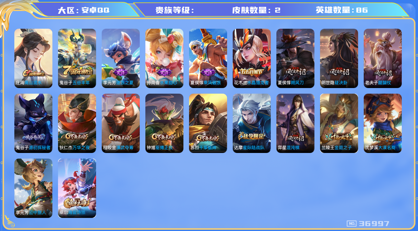 [36997]英雄数: 86 皮肤数: 2 勇者皮肤数: 46 史诗皮肤数: 10 传说皮肤数: 1 稀有英雄: 艾琳,娜可露露,不知火舞,桑启,戈娅 当前段位: 星耀 限定皮肤: 高山流水,五谷丰年 内测皮肤: 女武神 史诗皮肤: 逐浪之夏,水果甜心,乘风破浪,水晶猎龙者 赛季/战令皮肤: 朔风刀,混沌棋,疑决卦,醍醐杖,原初探秘者,万华元夜,演武夺筹,驱傩正仪,千军破阵,星际陆战队(达摩),金庭之子,大漠名商,云中旅人,海盐诗旅 实名: 有人脸修改机会/实名是本人 普通皮肤: 五福同心,龙腾万里,归虚梦演(鲁班大师),归虚梦演(曜),掌控之力,守护之力,化身博士,缤纷绘卷,黄金武士,天使之翼,红桃皇后,星际陆战队(程咬金),阴阳师,汉昭烈帝,兔女郎,死亡骑士,救世之瞳,白色死神,野性能量,冰雪圆舞曲,露花倒影,花见巫女,未来旅行,龙域领主,蔷薇王座,万圣前夜,异域舞娘,潮流仙人,东海龙王,战争女神,精灵王,加勒比小姐,死神来了,赤焰之缨,启蛰,棒球奇才,海之征途,精准探案法,花间舞,绝影神枪,阿摩司公爵,特种部队,隐刃,木偶奇遇记,海军大将,一千零一夜,英喵野望,前尘,碧珀绯影
