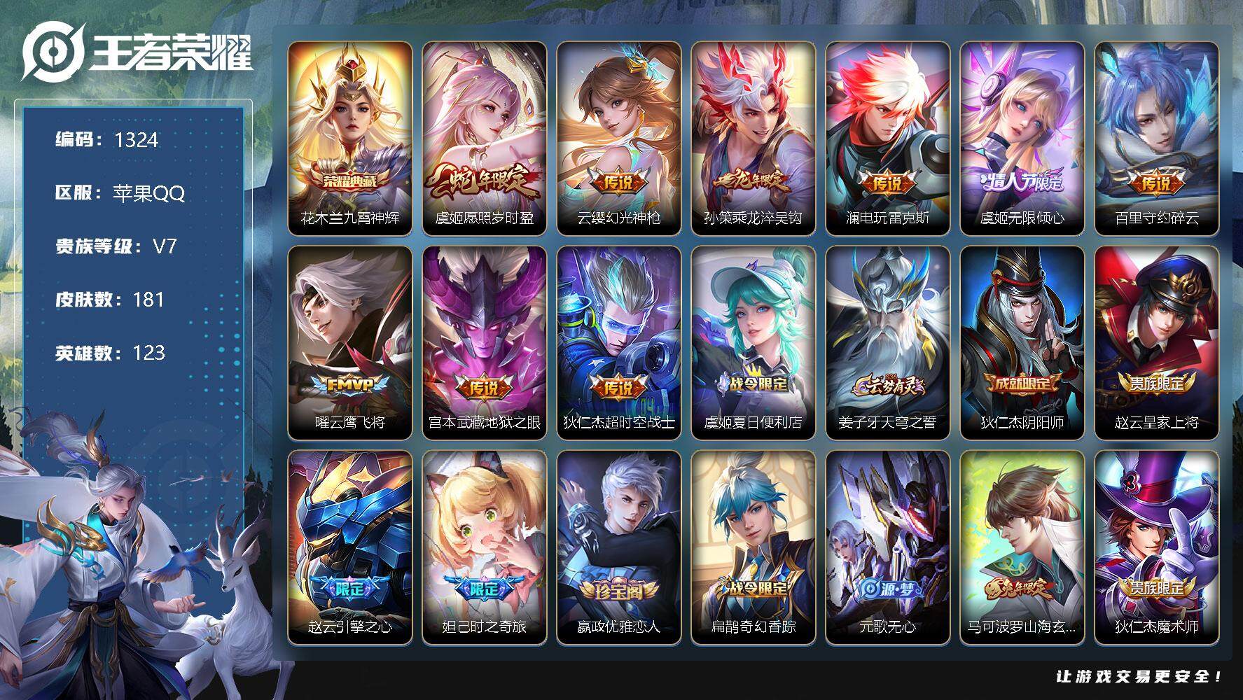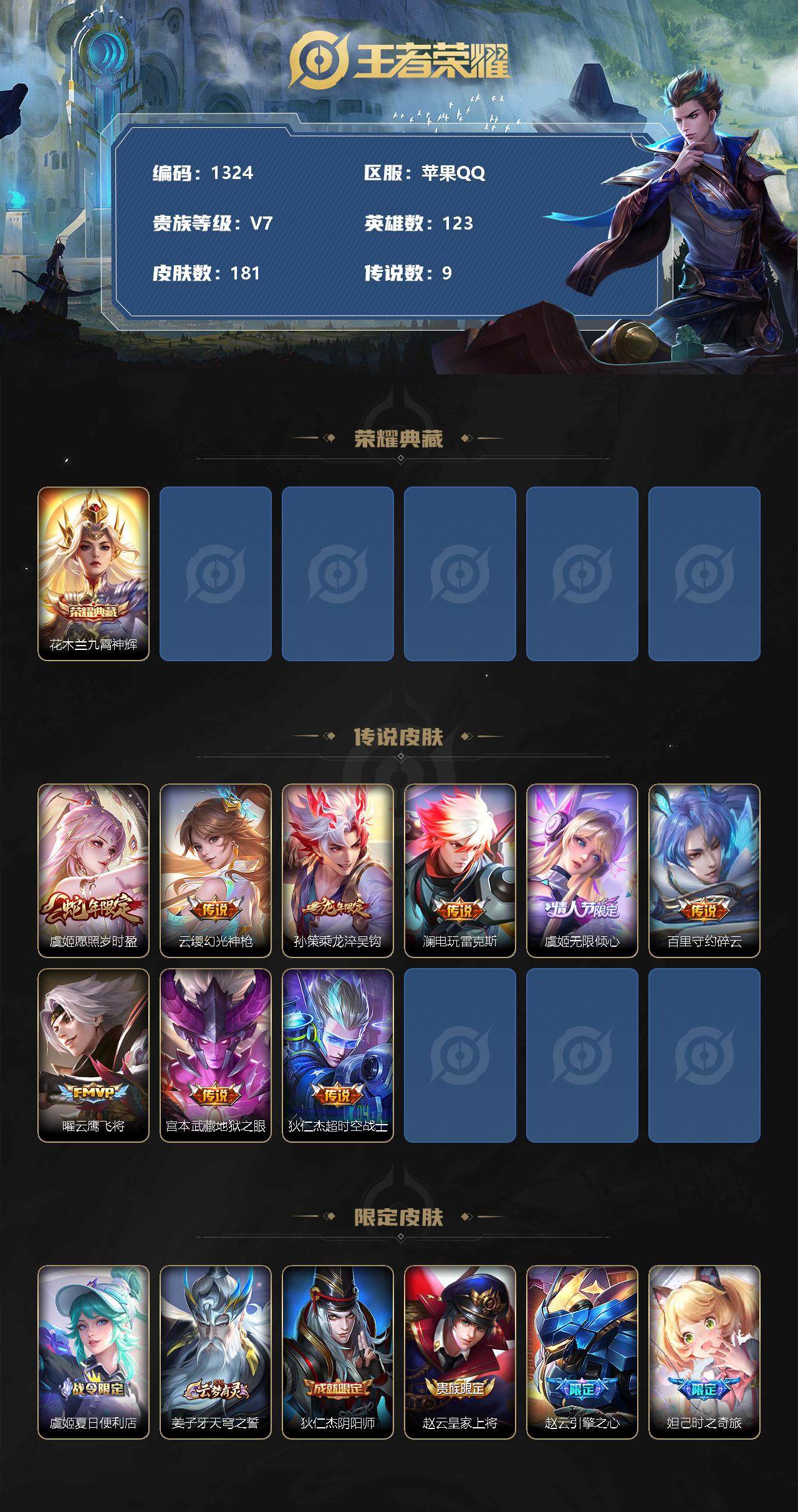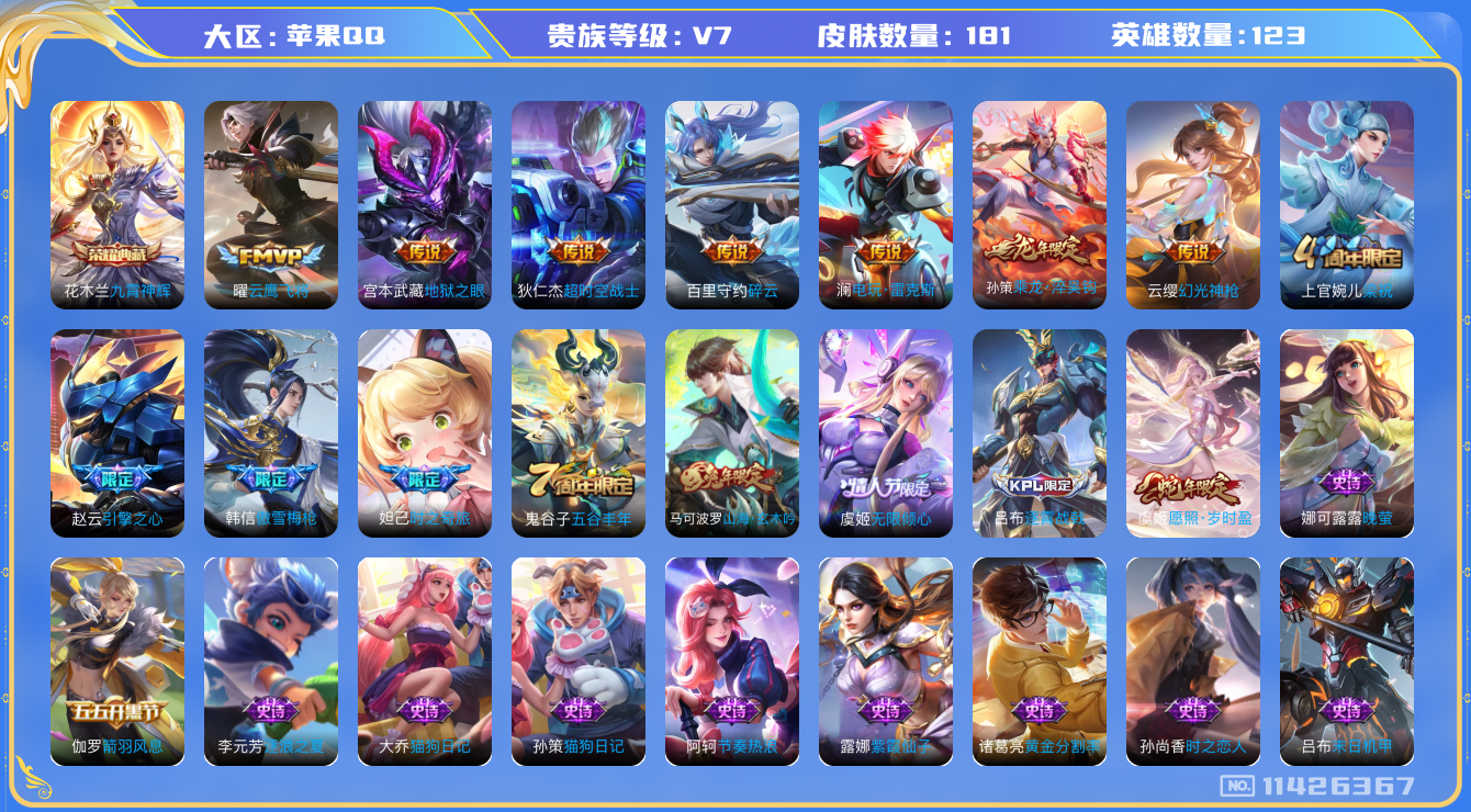 [11426367]【商品标题】:苹果Q-V0-永恒钻石V段位-123英雄-181皮肤-1典藏-0珍品无双-0无双-0珍品传说-9传说-53史诗