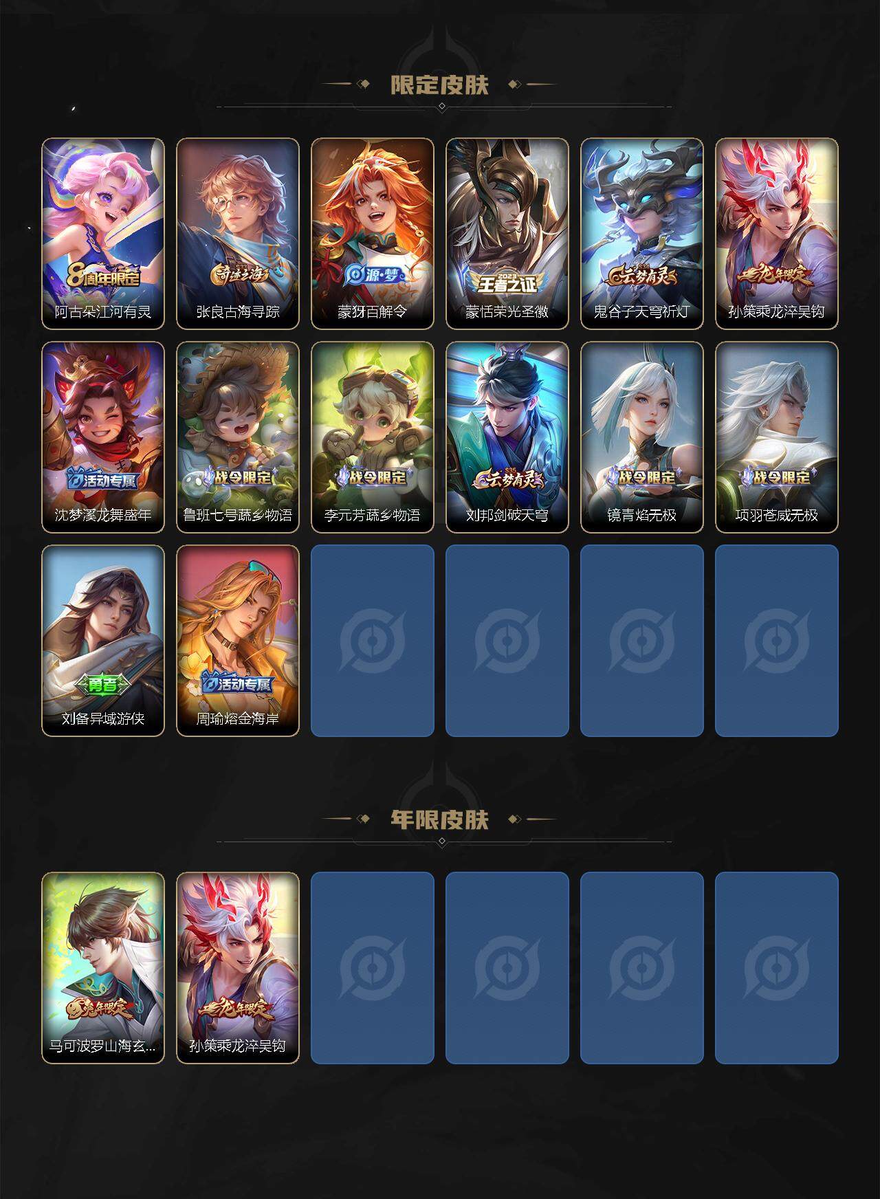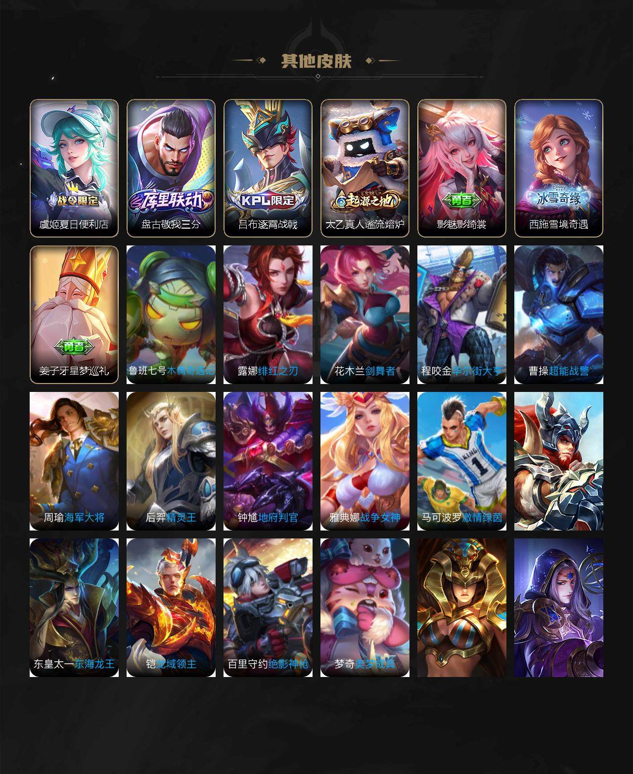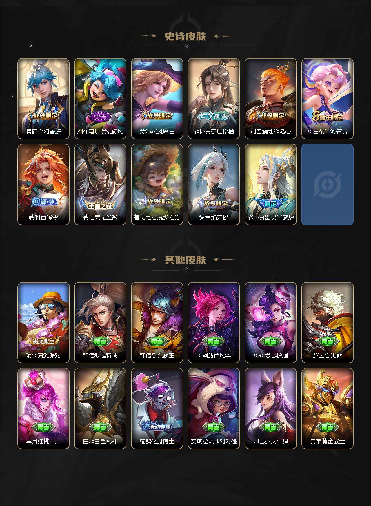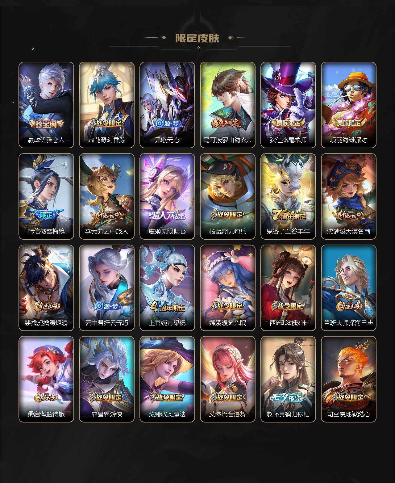 【限定皮肤】:虞姬夏日便利店,姜子牙天穹之誓,狄仁杰阴阳师,赵云皇家上将,赵云引擎之心,妲己时之奇旅,嬴政优雅恋人,扁鹊奇幻香踪,元歌无心,马可波罗山海玄木吟,狄仁杰魔术师,项羽海滩派对,韩信傲雪梅枪,李元芳云中旅人,虞姬无限倾心,杨戬潮玩骑兵,鬼谷子五谷丰年,沈梦溪大漠名商,裴擒虎擒涛扼浪,云中君纤云弄巧,上官婉儿梁祝,嫦娥暖冬兔眠,西施玲珑珍味,鲁班大师探海日志,桑启海盐诗旅,暃星界游侠,戈娅驭风魔法,艾琳流音漫舞,赵怀真鹤归松栖,司空震地狱燃心,阿古朵江河有灵,张良古海寻踪,蒙犽百解令,蒙恬荣光圣徽,鬼谷子天穹祈灯,孙策乘龙淬吴钩,沈梦溪龙舞盛年,鲁班七号蔬乡物语,李元芳蔬乡物语,刘邦剑破天穹,镜青焰无极,项羽苍威无极,刘备异域游侠,周瑜熔金海岸