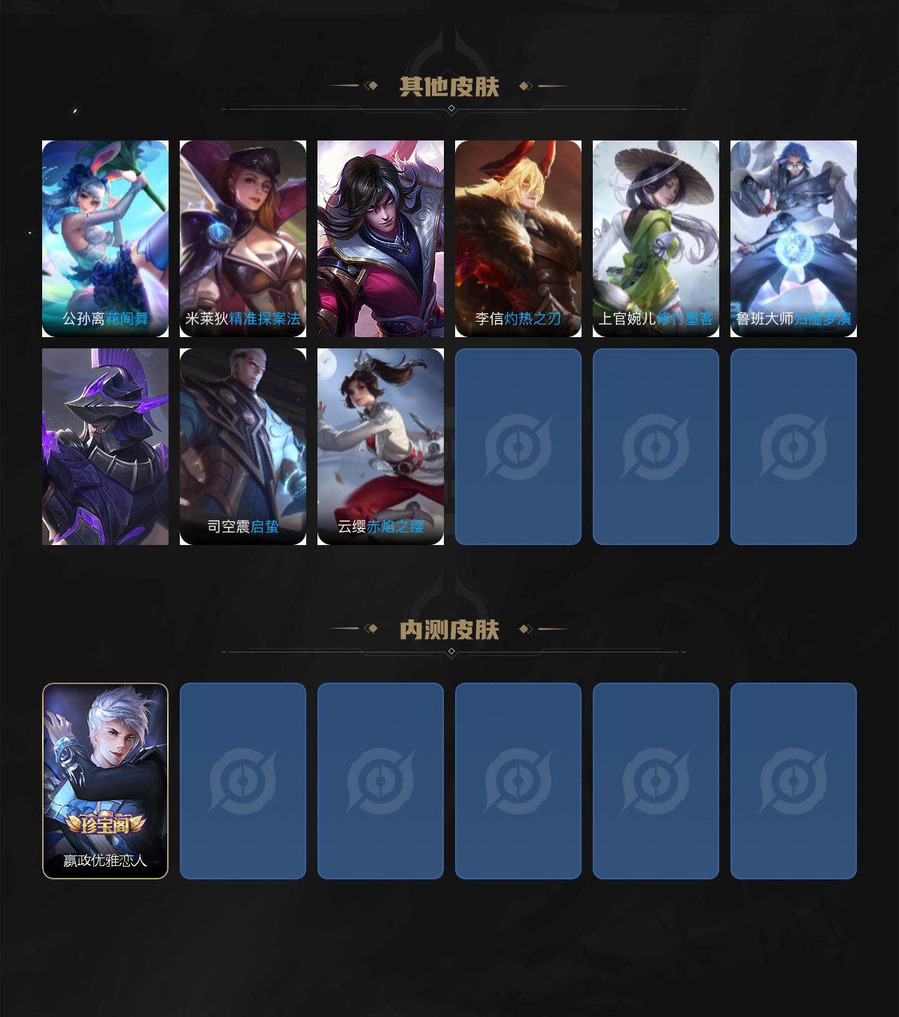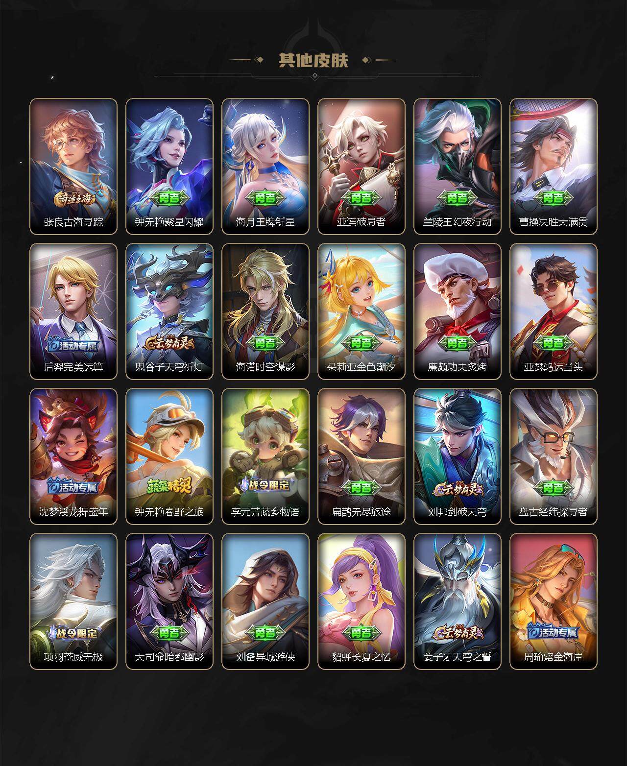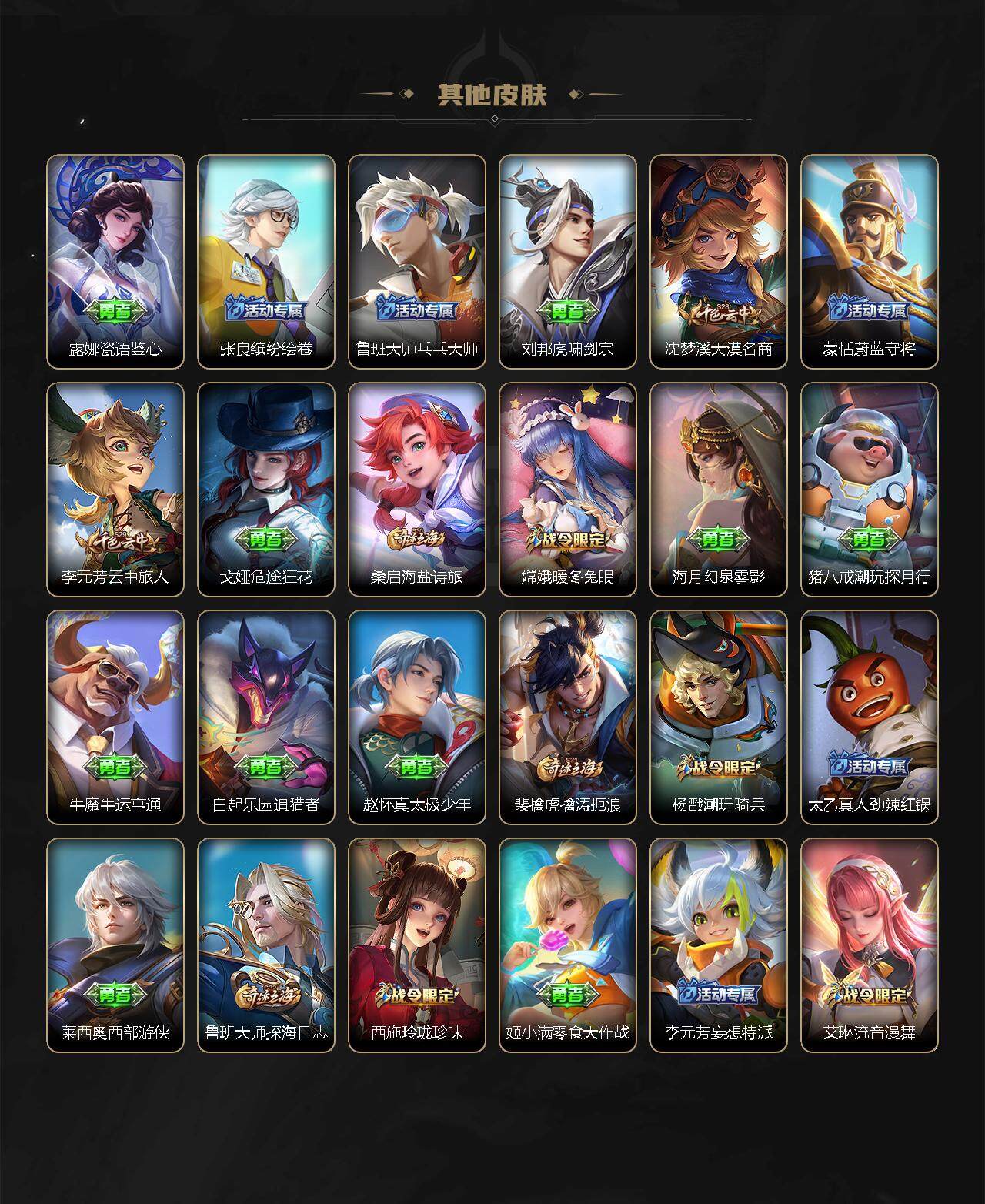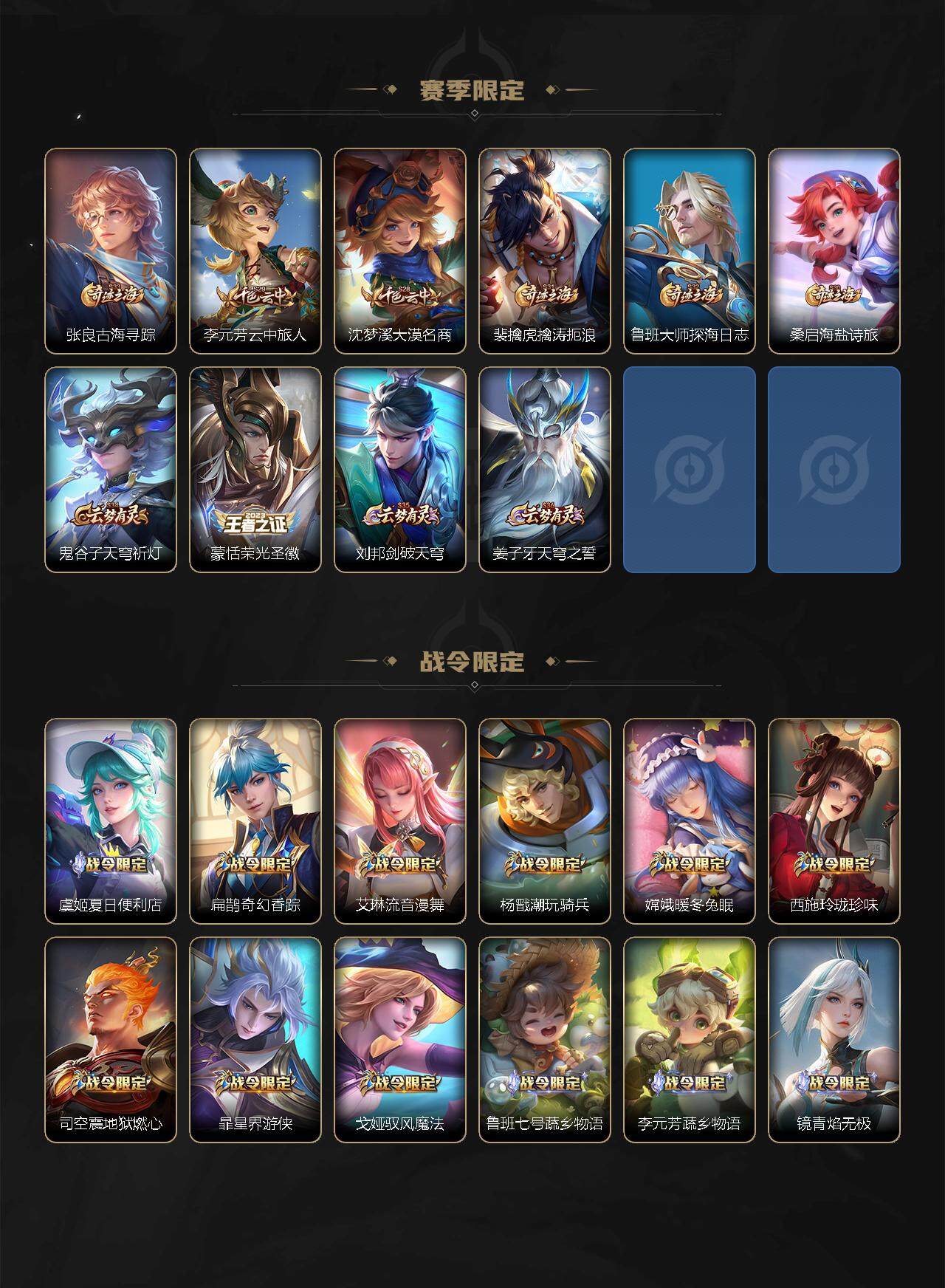 【赛季限定】:张良古海寻踪,李元芳云中旅人,沈梦溪大漠名商,裴擒虎擒涛扼浪,鲁班大师探海日志,桑启海盐诗旅,鬼谷子天穹祈灯,蒙恬荣光圣徽,刘邦剑破天穹,姜子牙天穹之誓