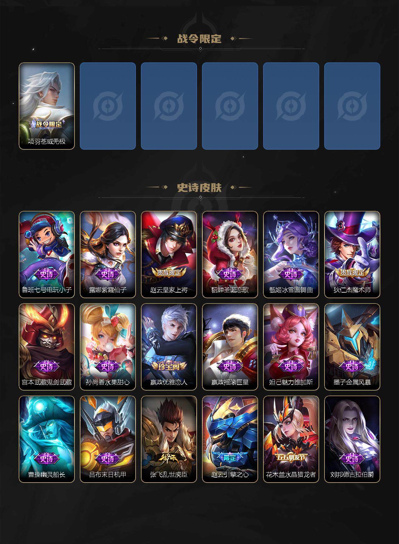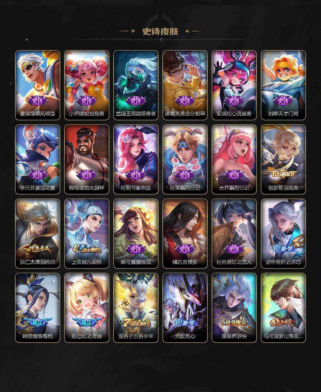 【史诗皮肤】:鲁班七号电玩小子,露娜紫霞仙子,赵云皇家上将,貂蝉圣诞恋歌,甄姬冰雪圆舞曲,狄仁杰魔术师,宫本武藏鬼剑武藏,孙尚香水果甜心,嬴政优雅恋人,嬴政摇滚巨星,妲己魅力维加斯,墨子金属风暴,曹操幽灵船长,吕布末日机甲,张飞乱世虎臣,赵云引擎之心,花木兰水晶猎龙者,刘邦德古拉伯爵,夏侯惇乘风破浪,小乔缤纷独角兽,兰陵王暗隐猎兽者,诸葛亮黄金分割率,安琪拉心灵骇客,刘禅天才门将,李元芳逐浪之夏,程咬金功夫厨神,阿轲节奏热浪,孙策猫狗日记,大乔猫狗日记,伽罗箭羽风息,狄仁杰鹰眼统帅,上官婉儿梁祝,娜可露露晚萤,橘右京修罗,孙尚香时之恋人,云中君纤云弄巧,韩信傲雪梅枪,妲己时之奇旅,鬼谷子五谷丰年,元歌无